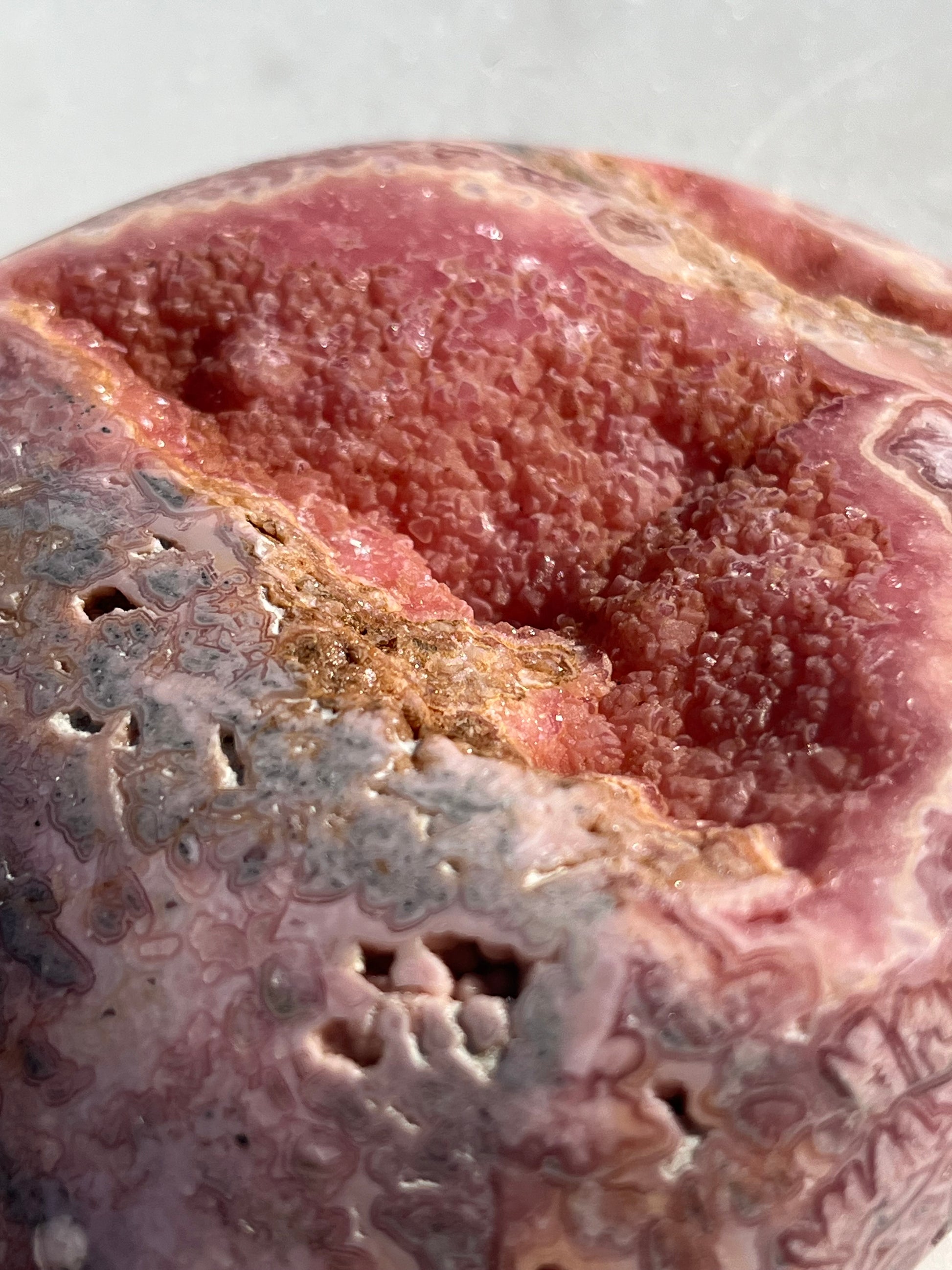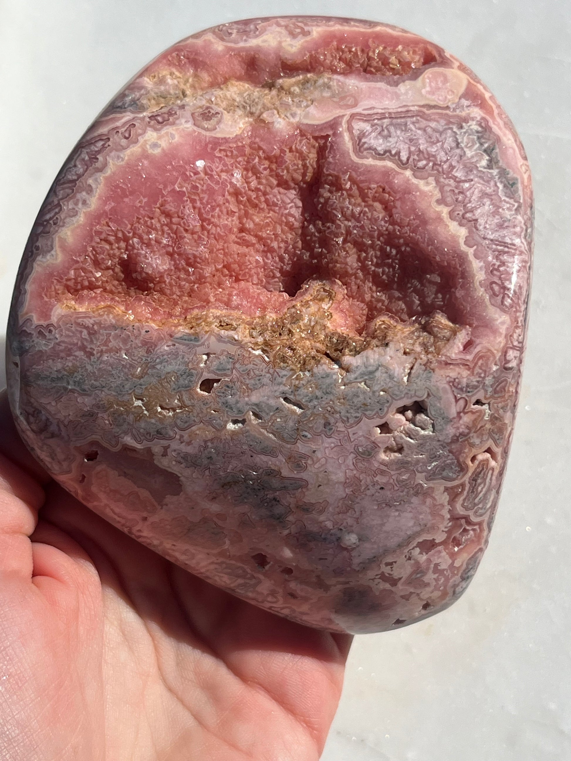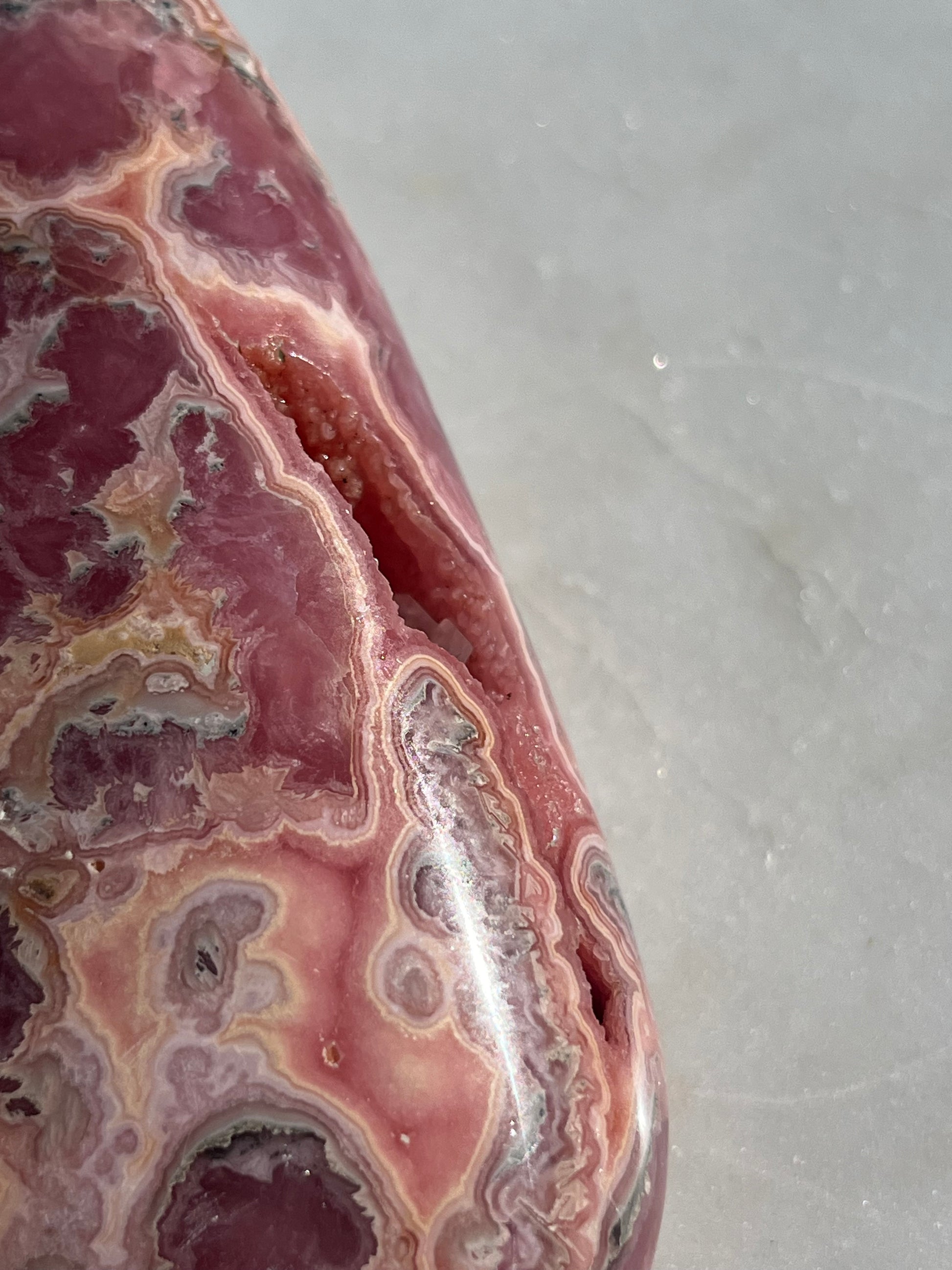 ‘Haven’ Polished Rhodochrosite Vug Freeform w/Terminated Calcite #1