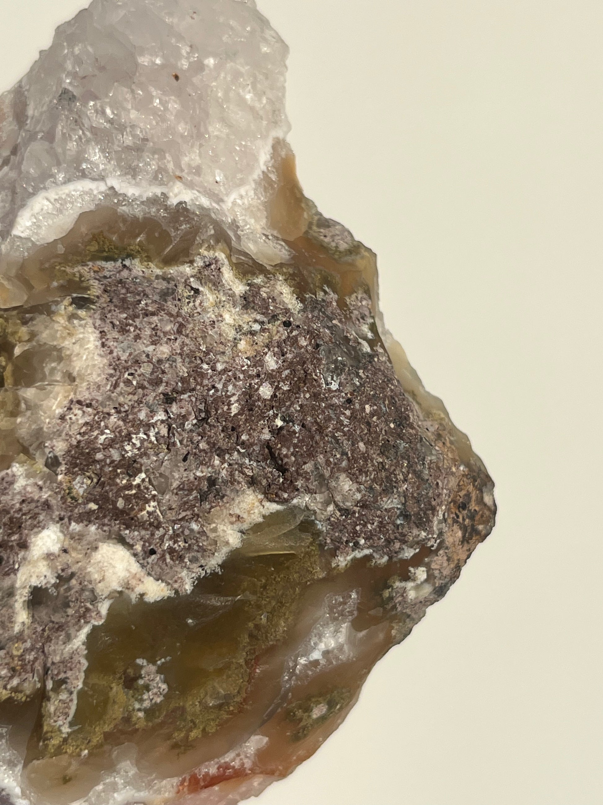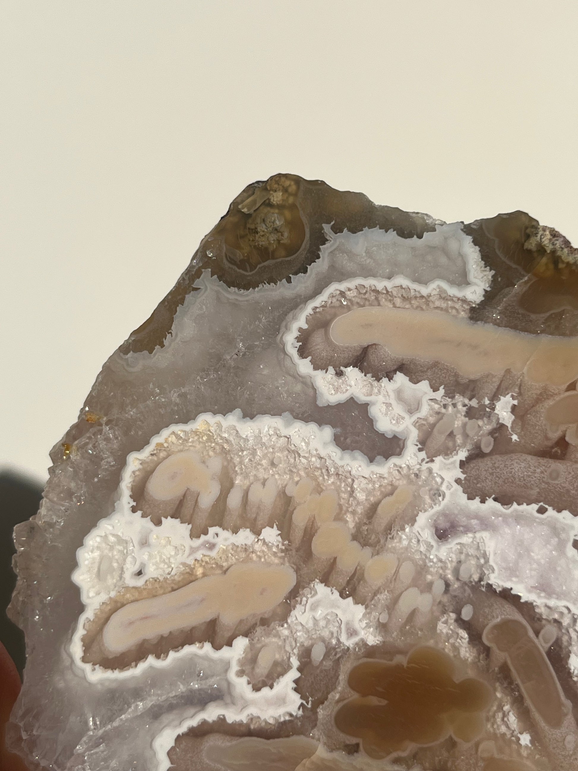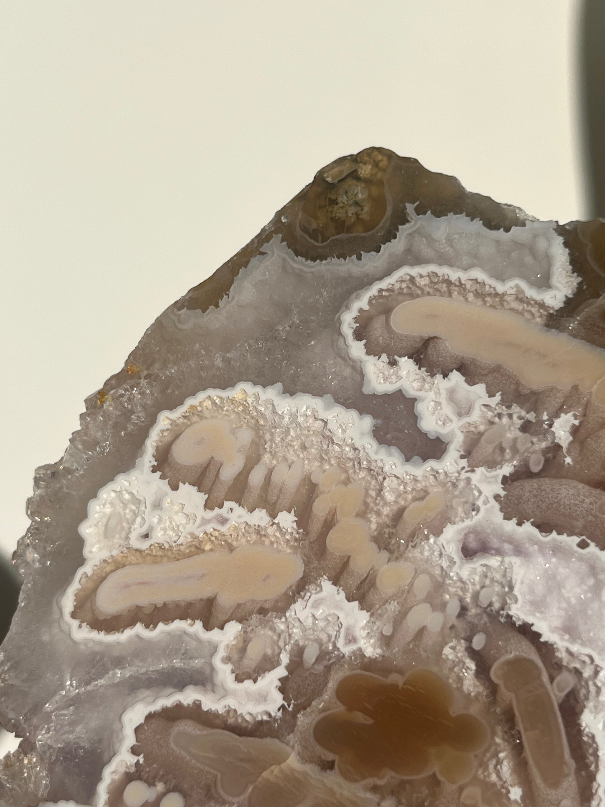 ‘Coralline Tides’ Spherulitic Columnar Nebula Agate with Scenic Moss, Amethyst and Natural Carnelian Semi Polished Freeform