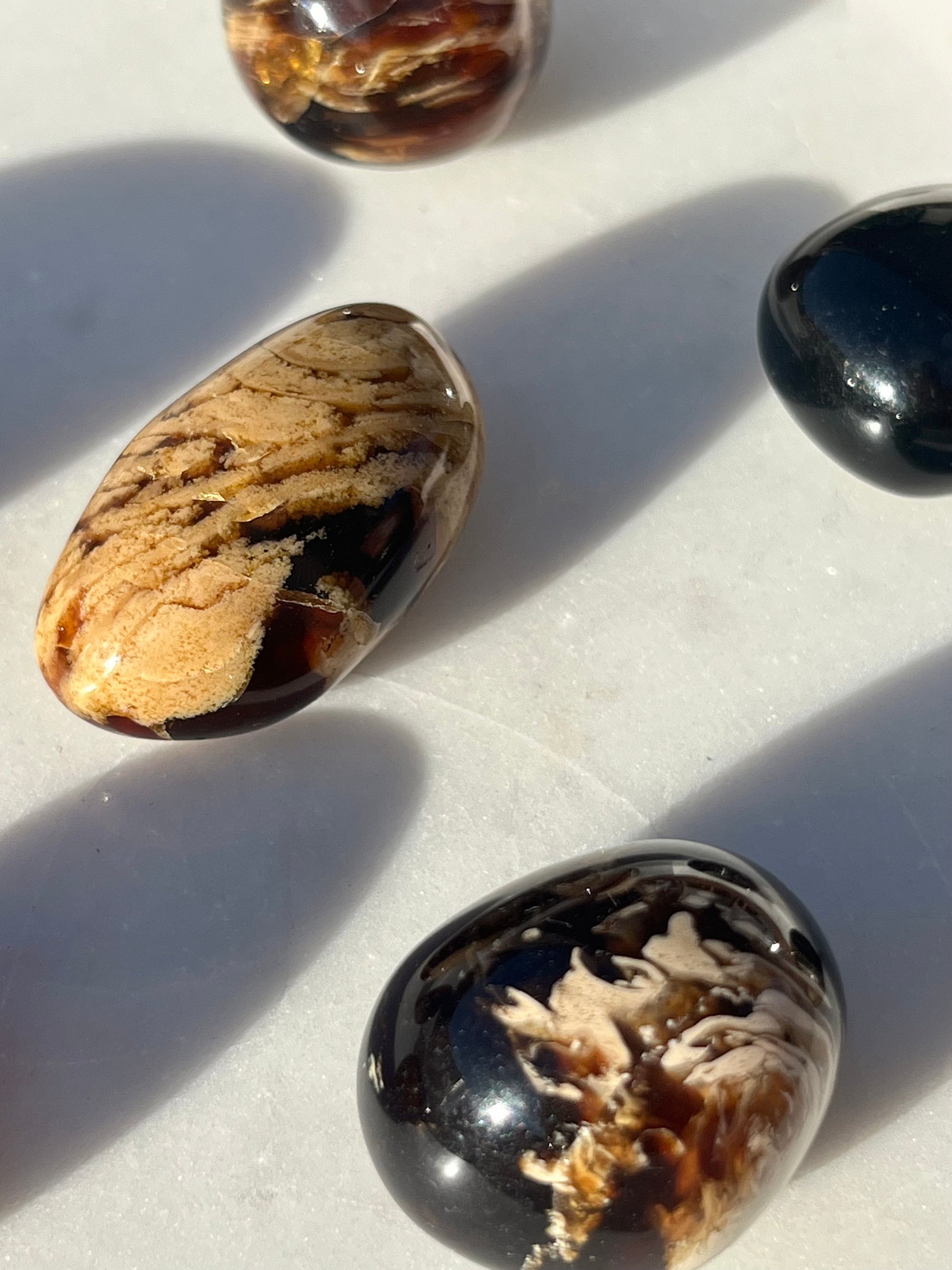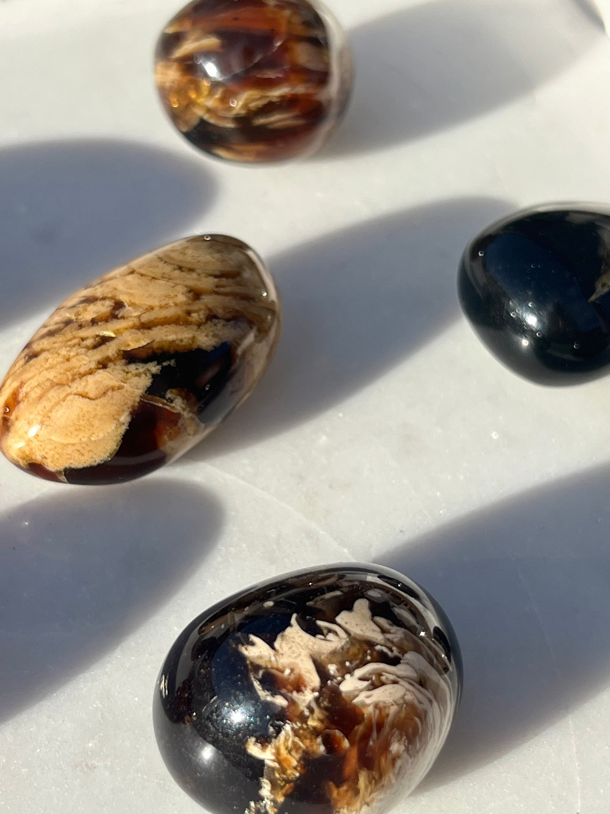 El ámbar es savia de árbol fosilizada. Suele contener insectos, microorganismos y/o material vegetal fosilizados que tienen millones de años. El ámbar azul de Indonesia se llama así porque emite un color azul verdoso fluorescente bajo la luz ultravioleta.