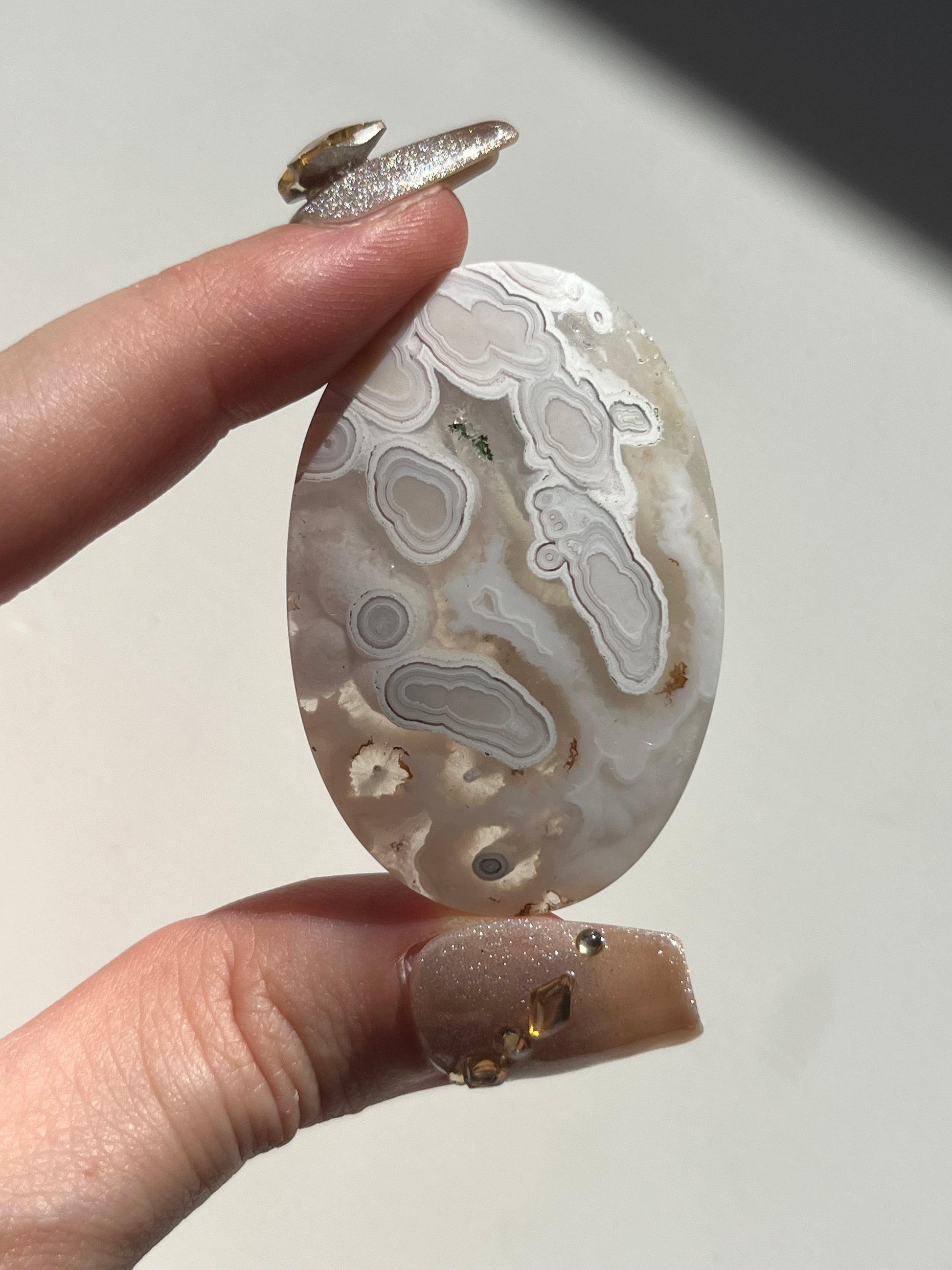 Nebula Agate is a new find from Indonesia first named by the founders of Priestess Crystals. With enchanting orbicular agate rings that pierce through a translucent chalcedony. Depending on how the stone is carved, multicoloured moss & dendritic inclusions can be present.
