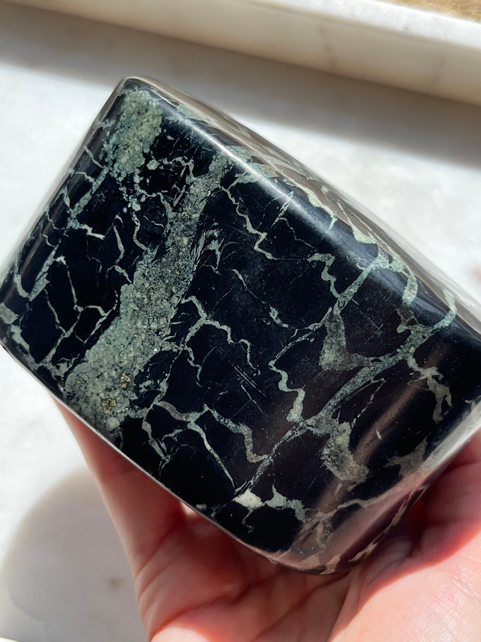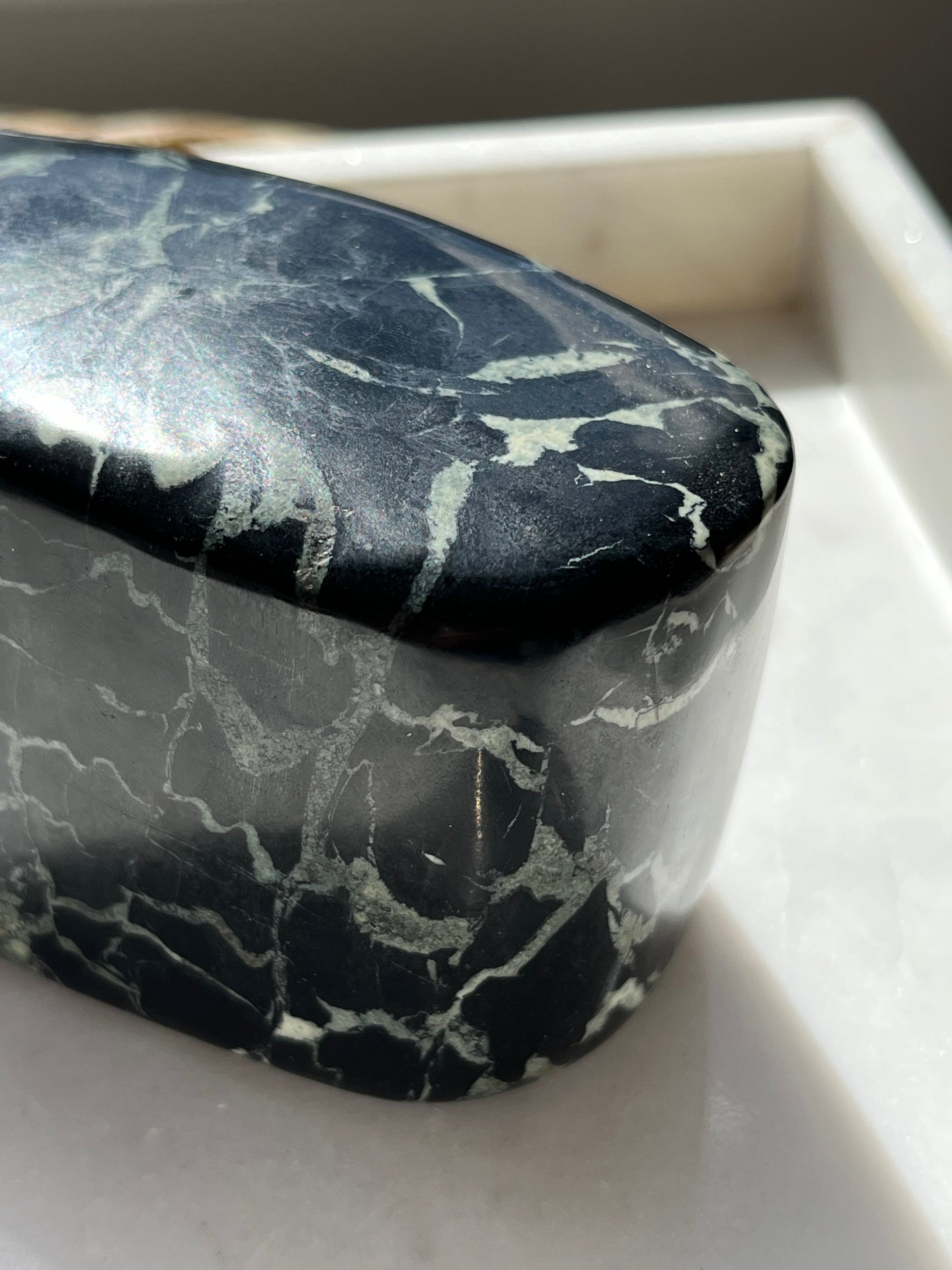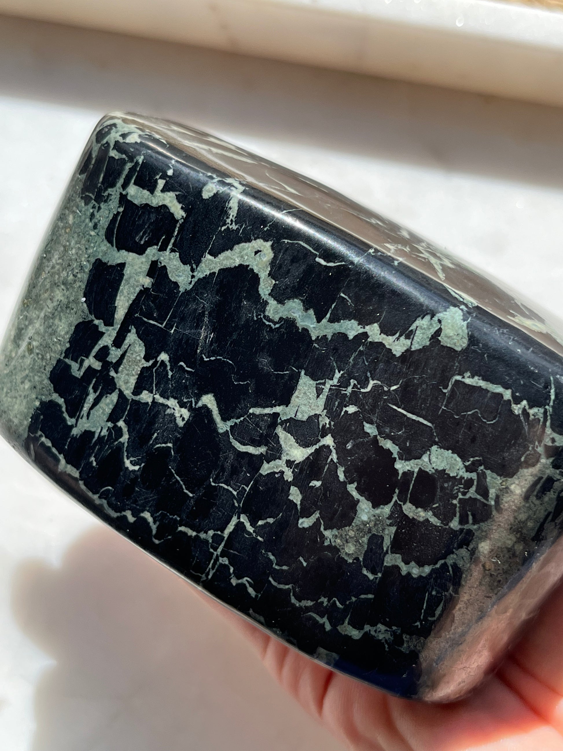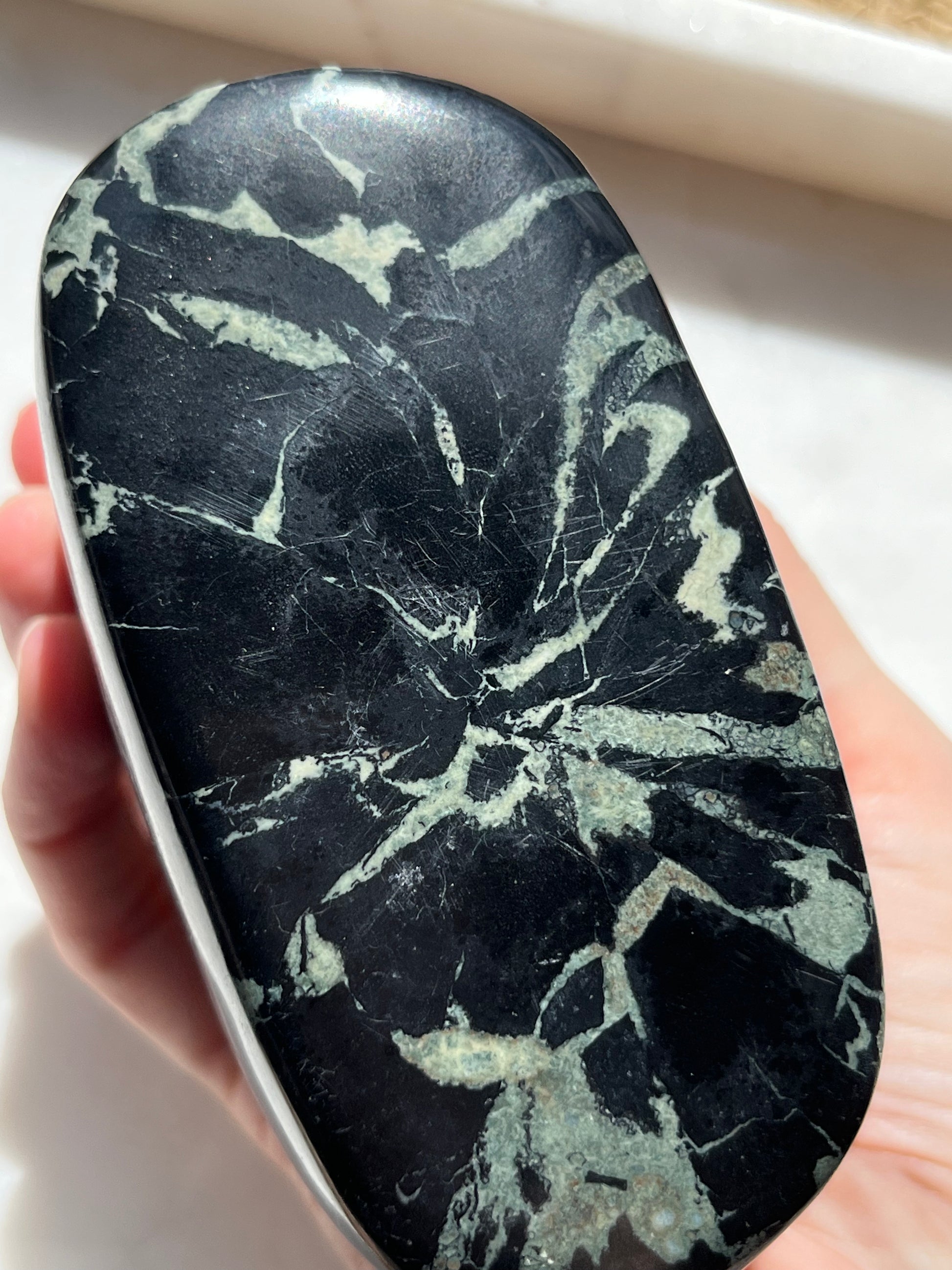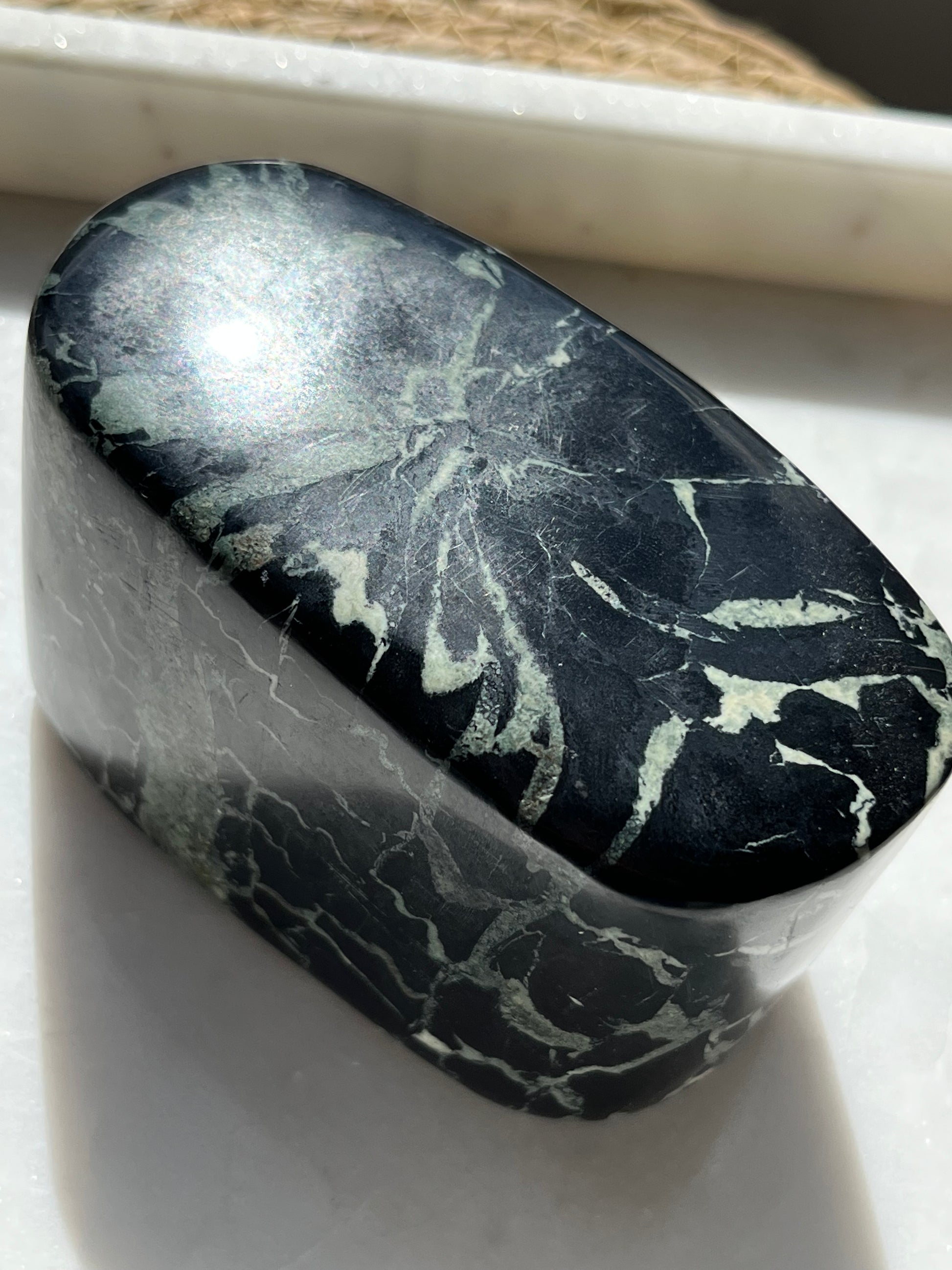 Known to locals as “Black Larimar” this stone is actually a type of Petrified Palm that forms in between the veins of the blue pectolite stone, Larimar.