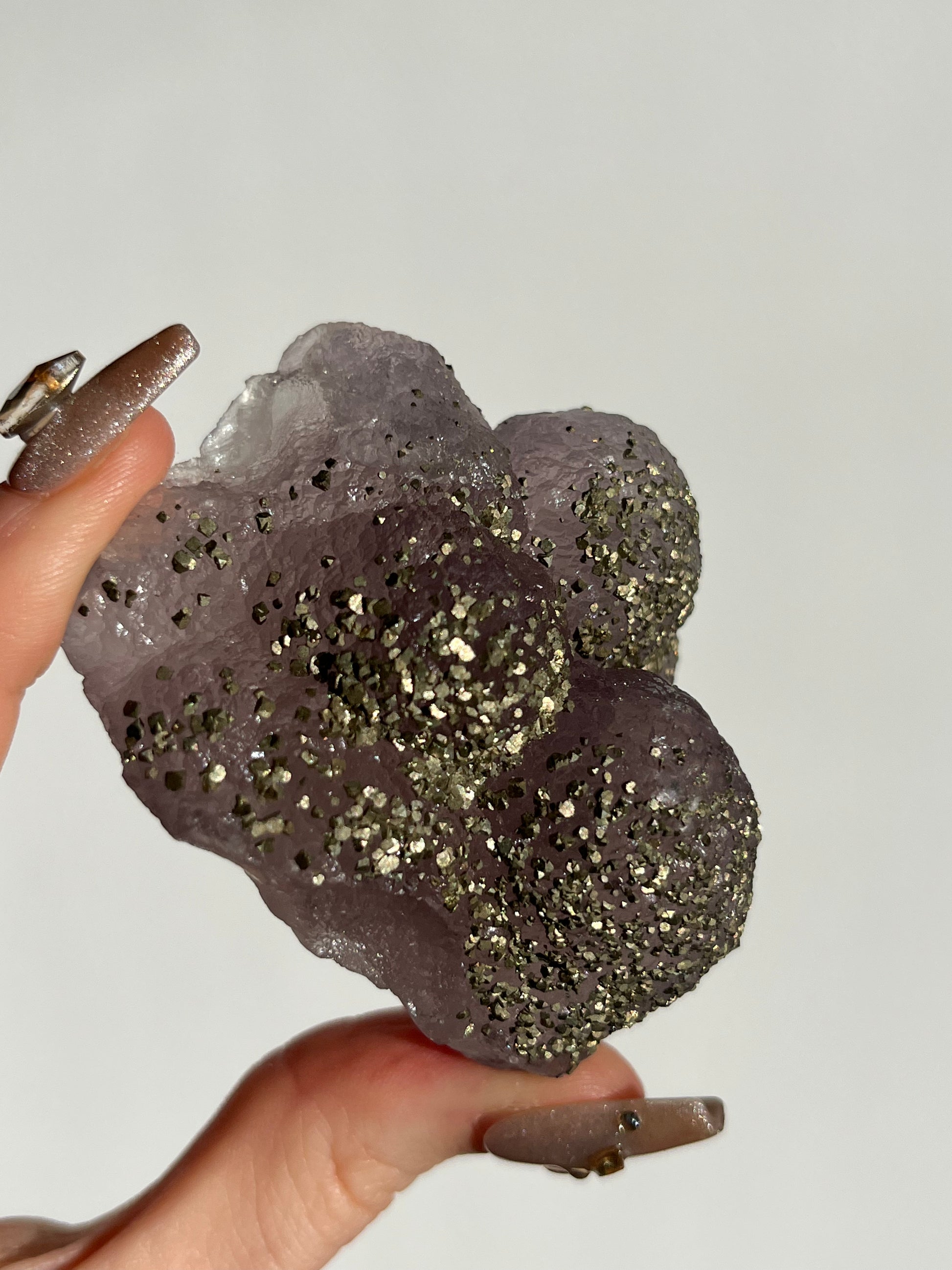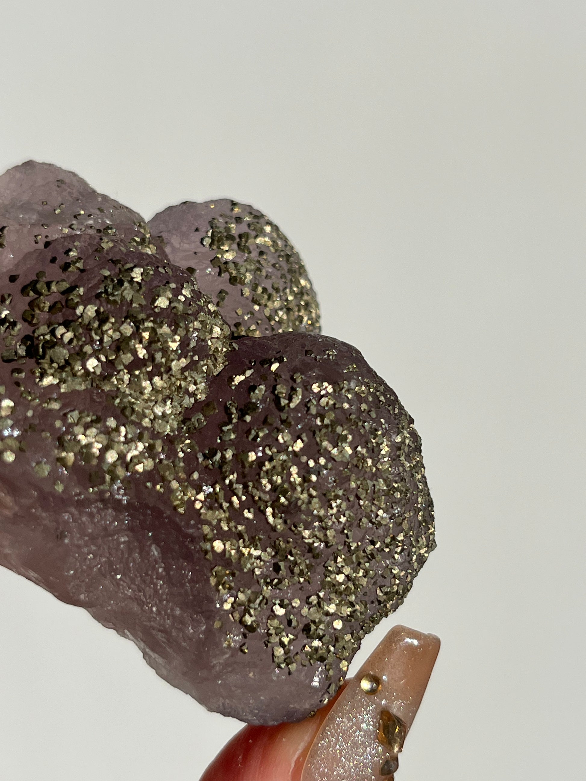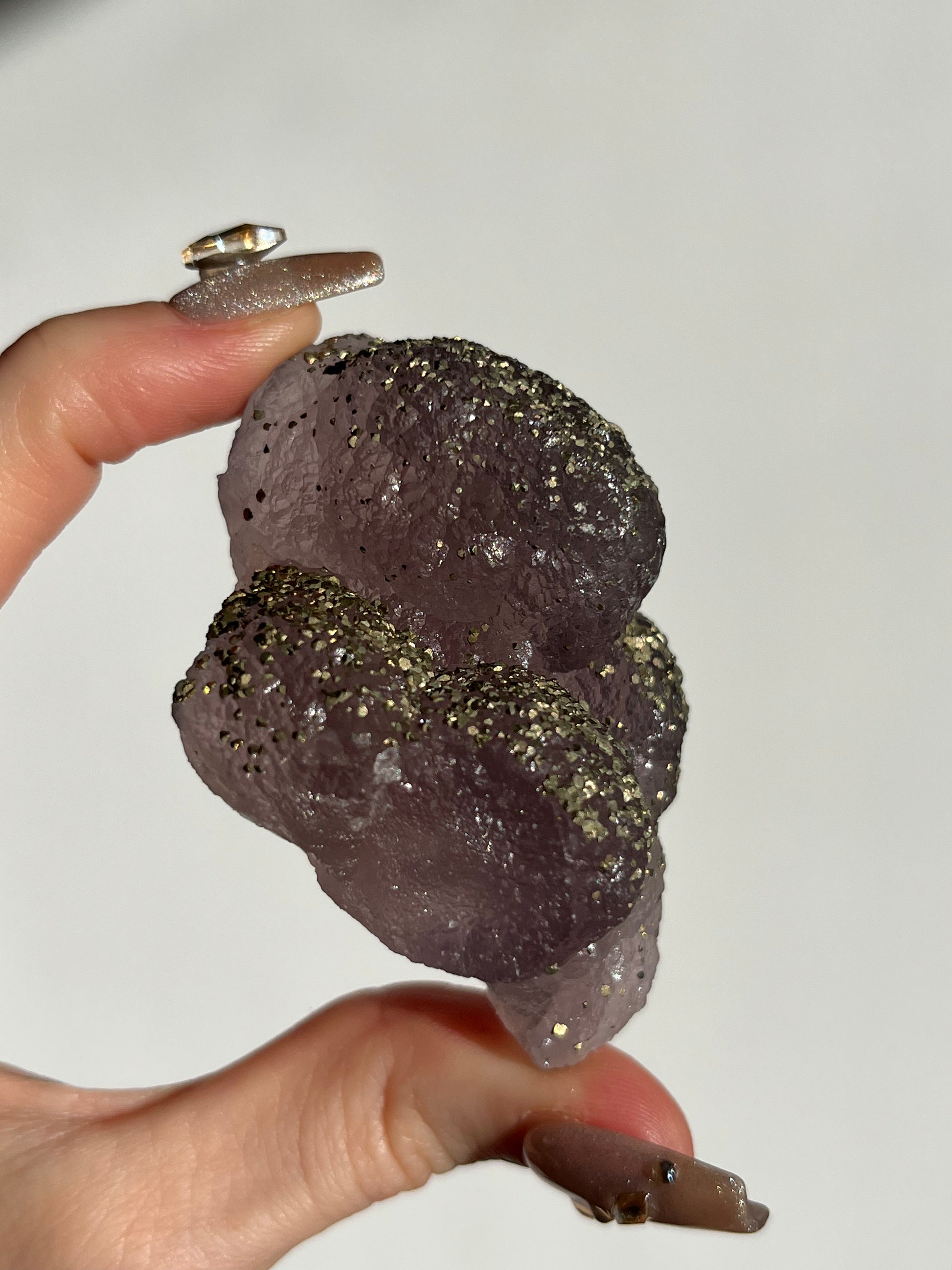 Metaphysically, this rare pairing of Purple Botryoidal Fluorite and Pyrite serves as a bridge between intuition and strength. The grape-like formations of this fluorite variety soothe the mind and awaken the third eye, while golden pyrite anchors in a sense of confidence, protection, and personal power. Working together to promote clarity, energetic shielding, and visionary insight that is grounded in action.