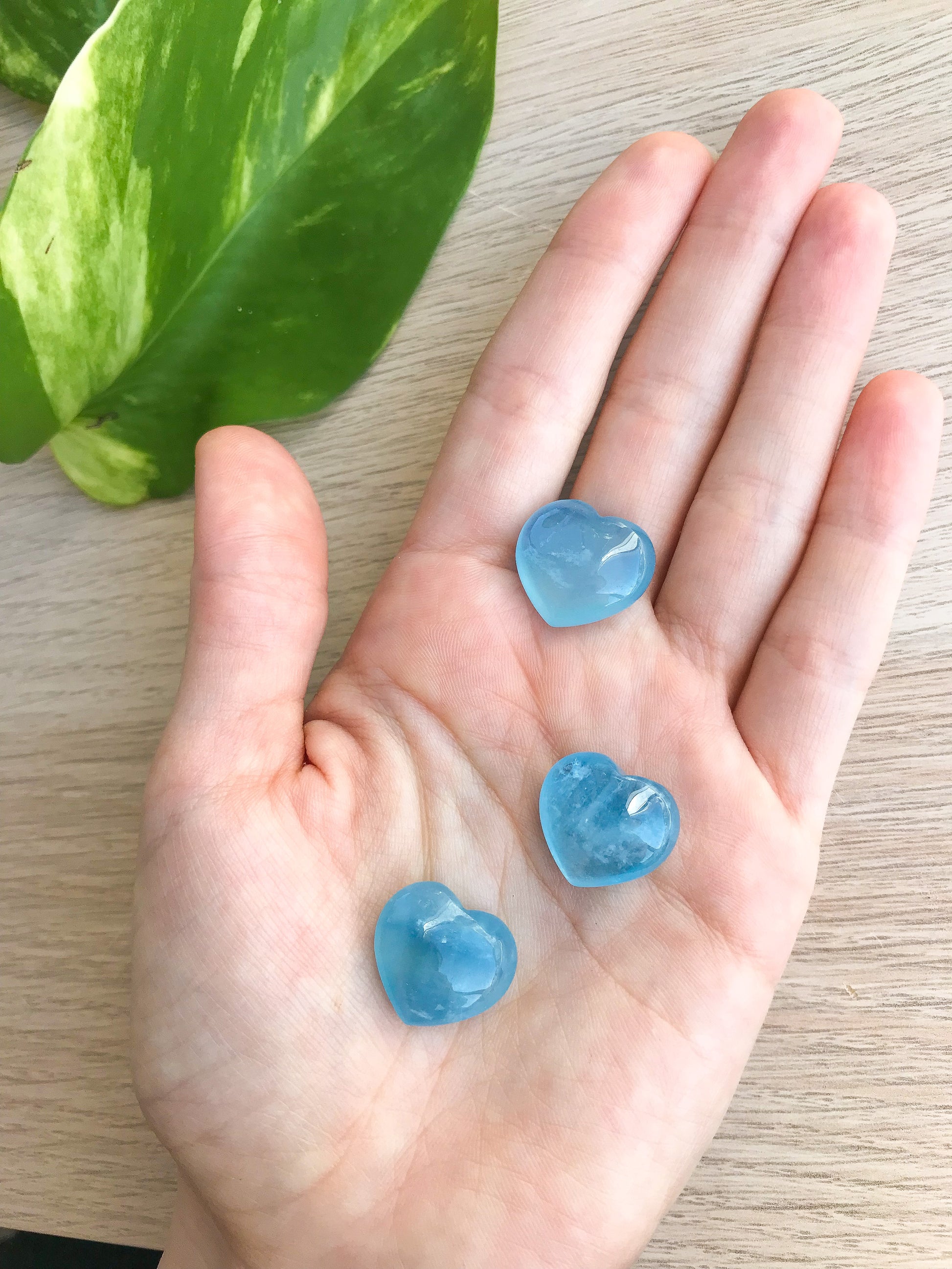 Stone of gentleness, the water and air elements, these gemmy Aquamarine hearts resonate with peaceful, light energies.