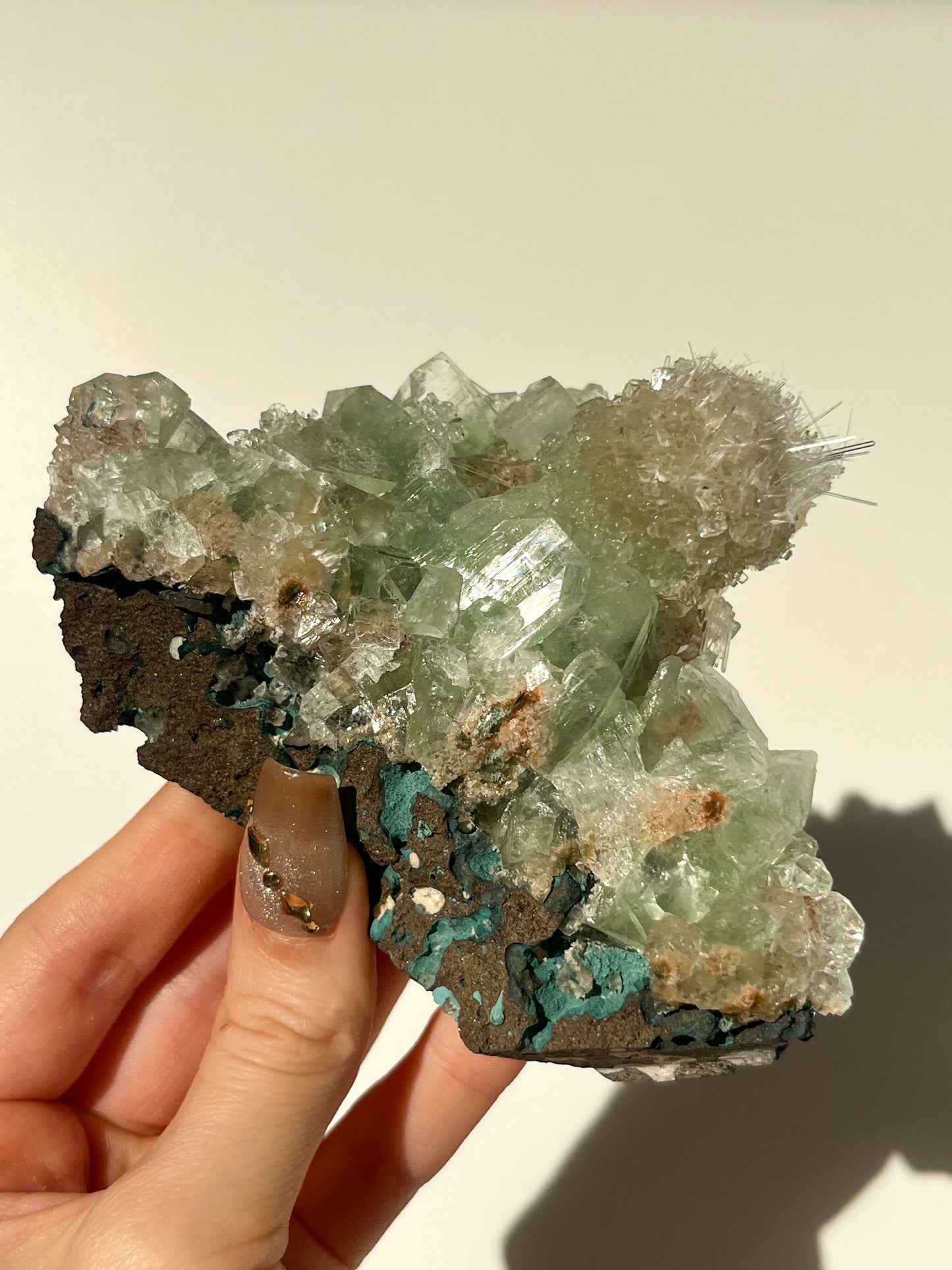 This find of Green Apophyllite, Thomsonite, Mesolite & Calcite specimens are a recent find in 2024 from the Apophyllite mines of India. This latest mineral discovery is from only one find. Making this desirable crystal combination not only rare, but a very exciting one.