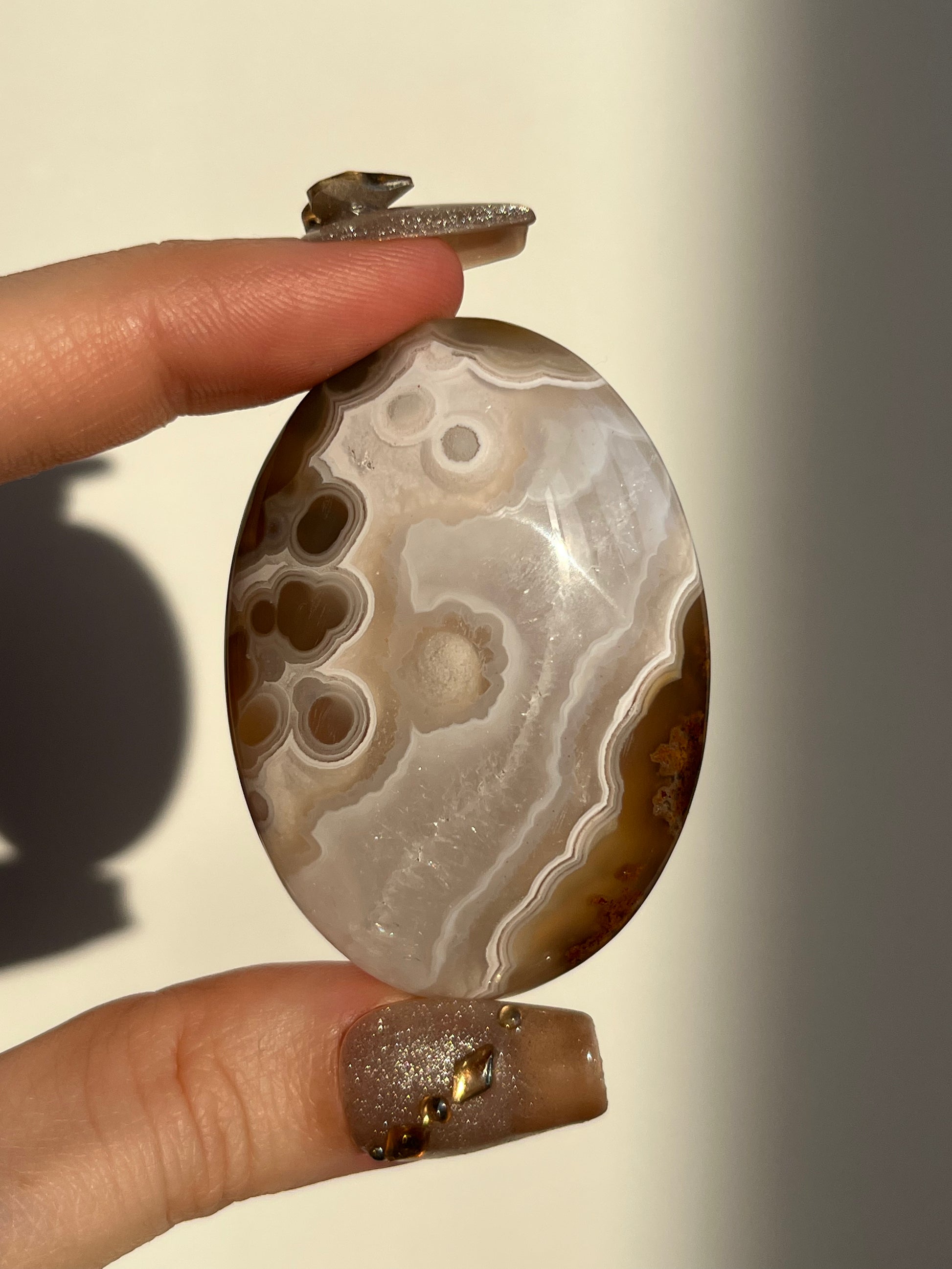 Nebula Agate is a recent find from Indonesia first named by the founders of Priestess Crystals. With enchanting multicoloured moss and orbicular agate rings that pierce through translucent chalcedony.