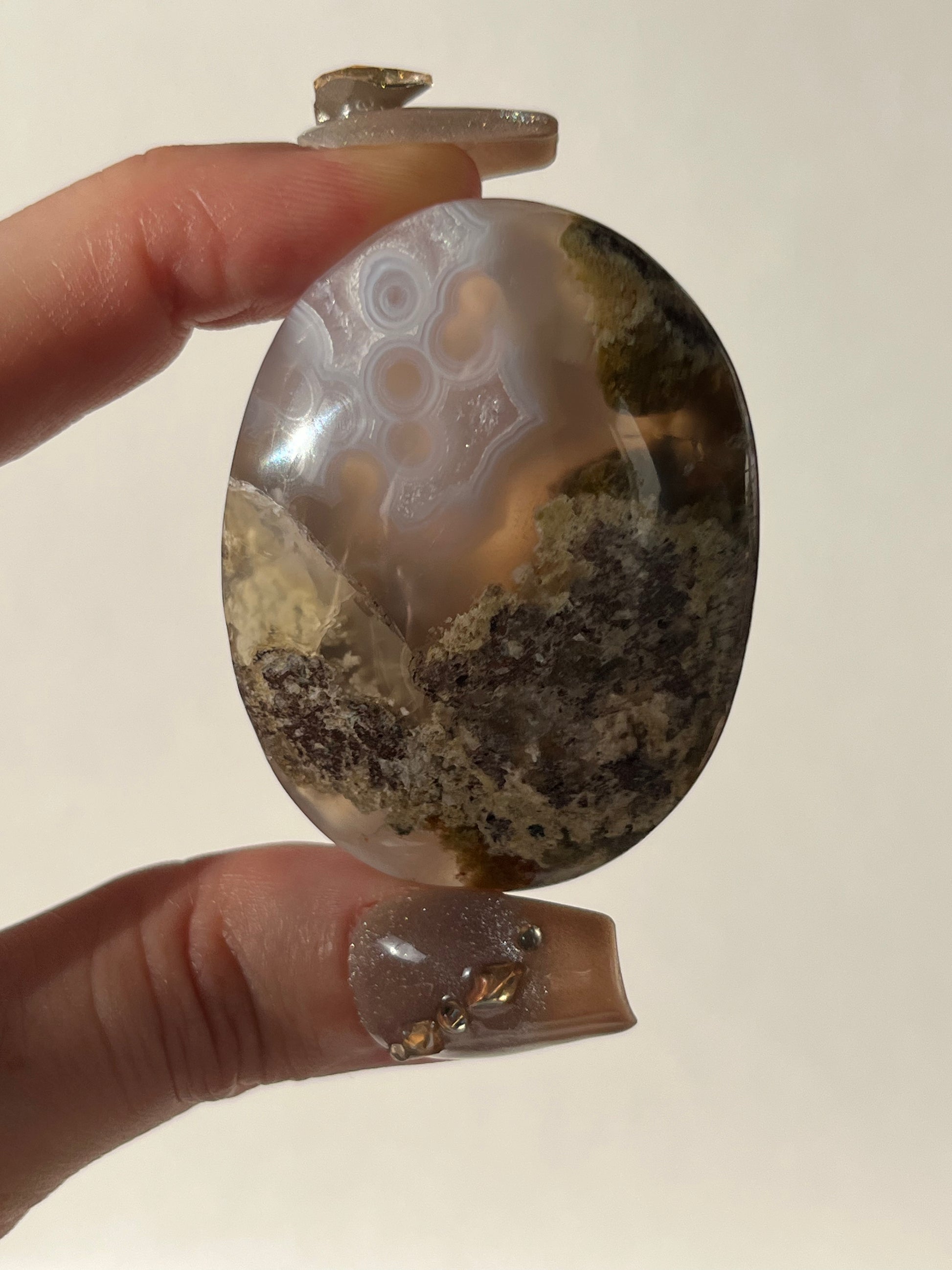 Jelly Orbicular Nebula Agate with Scenic Moss Palmstone W