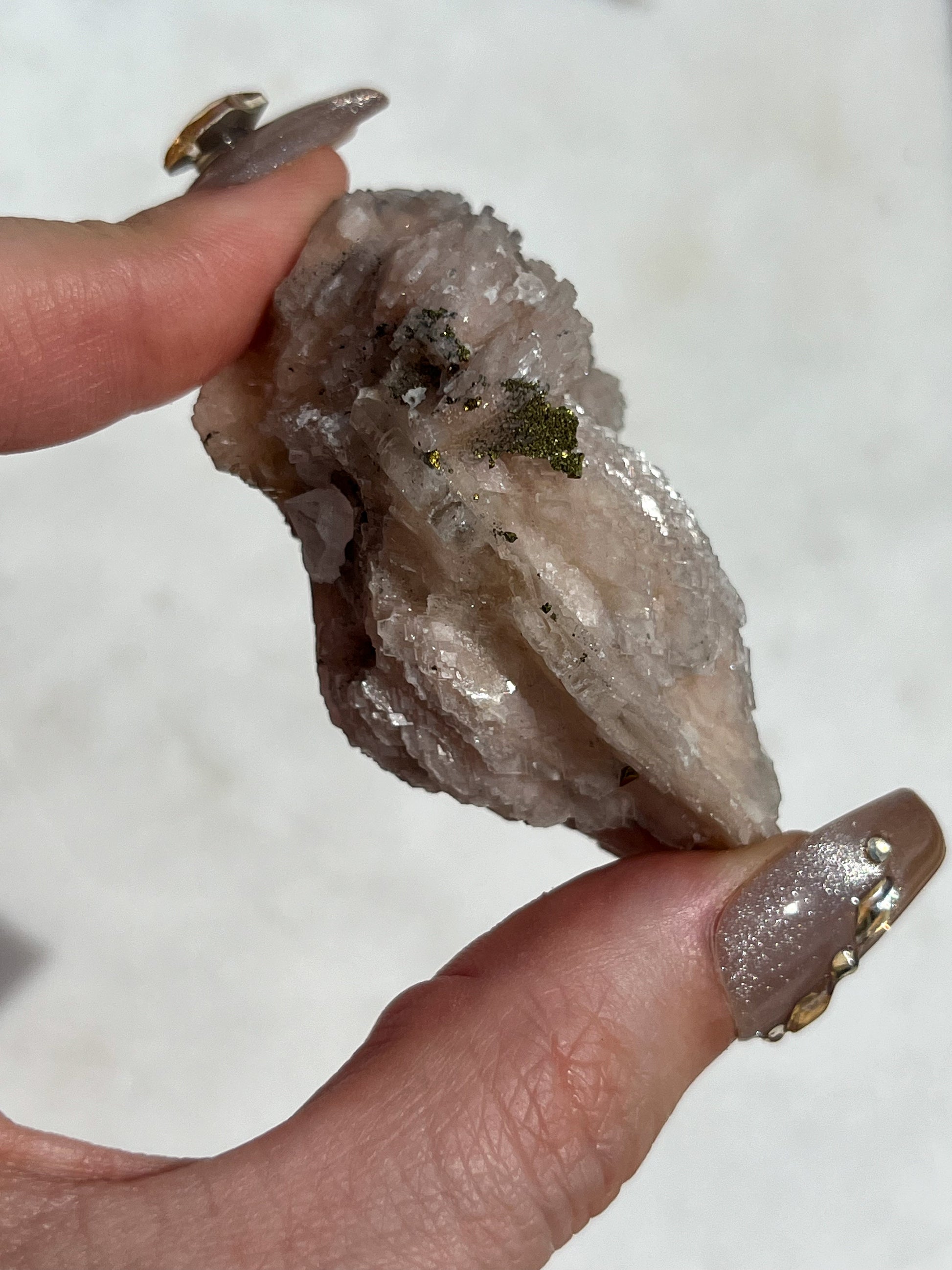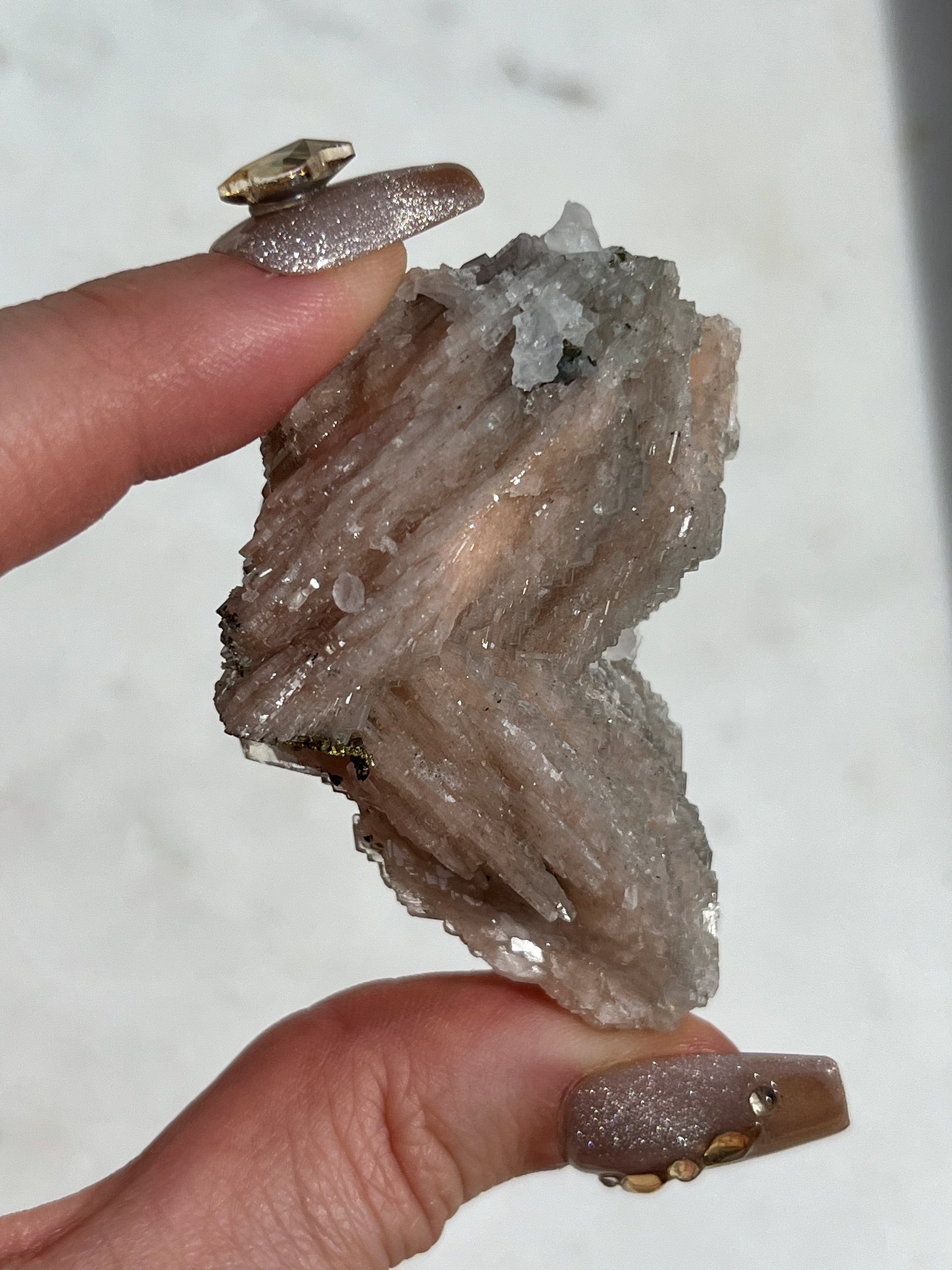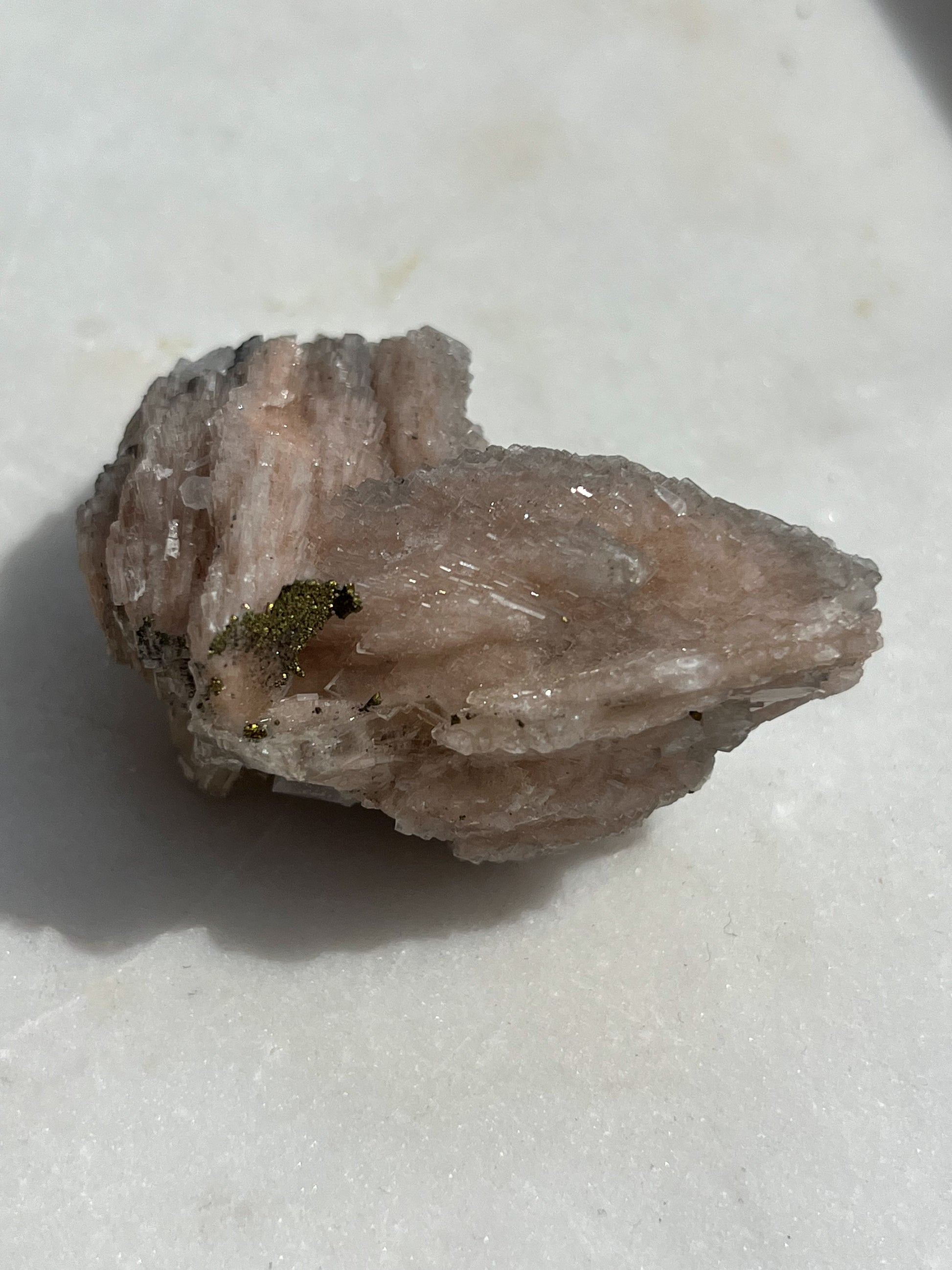 Recently discovered in 2024, this new variety of Barite from Morocco features soft pink hues contrasted against golden Marcasite and silver toned Galena