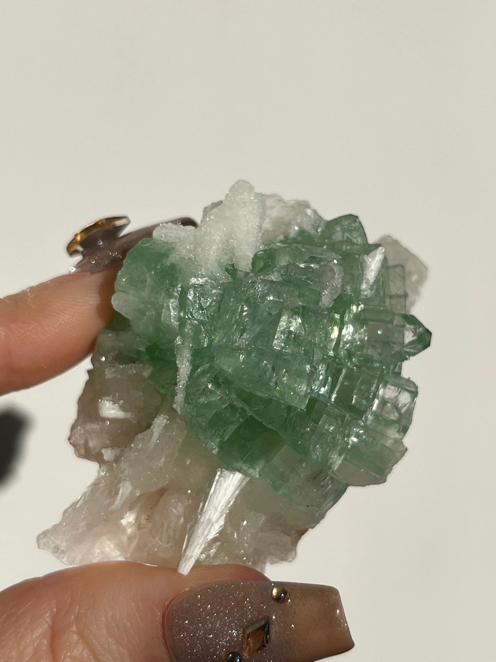 Green Apophyllite awakens the heart and clears energy with vibrant, high-frequency light, while Stilbite adds softness, comfort, and gentle guidance. Together, they balance clarity with compassion, grounding spiritual insight into everyday life.