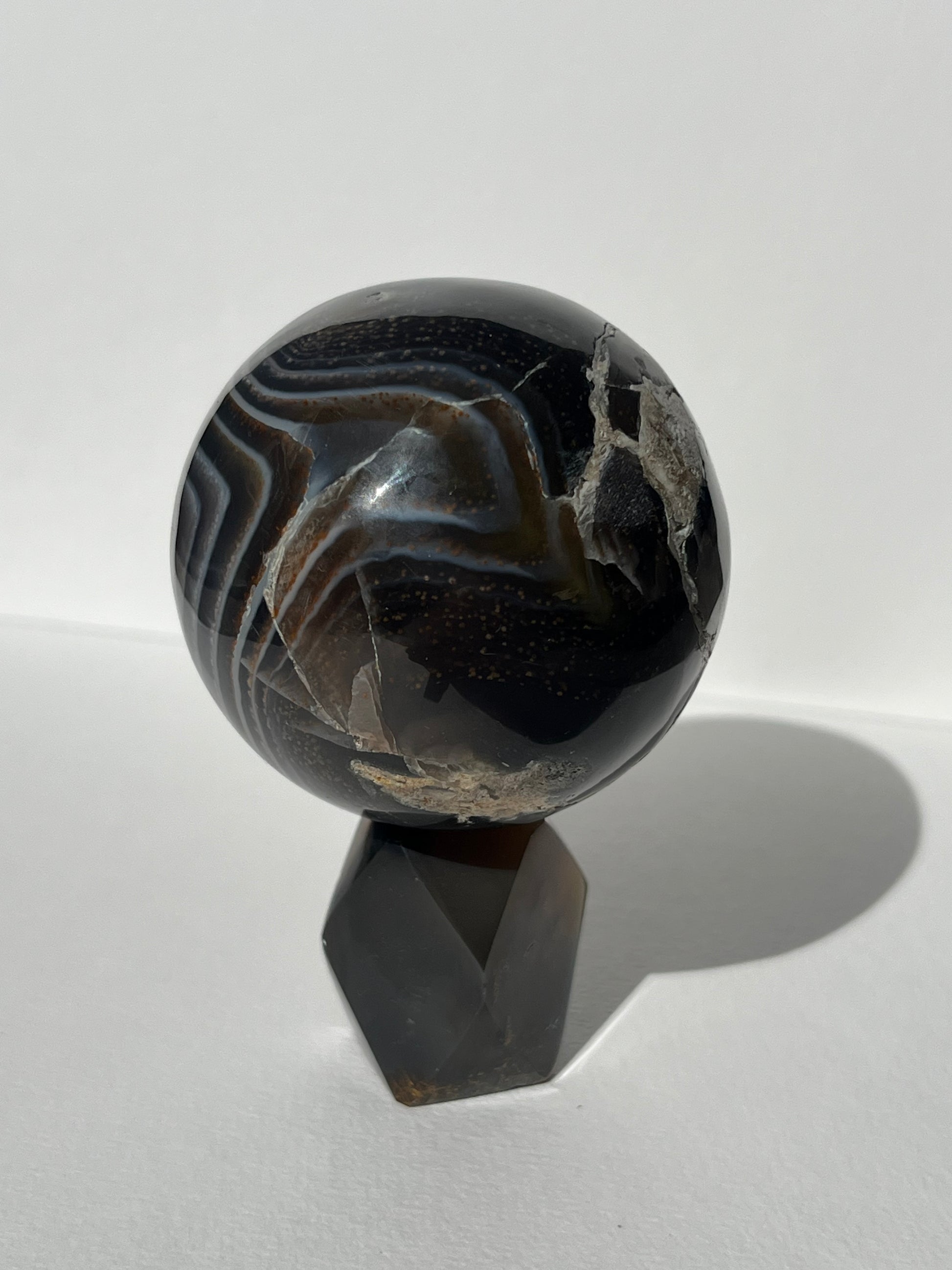 Purple Banded Agate Sphere on Geometric Faceted Crystal Stand A