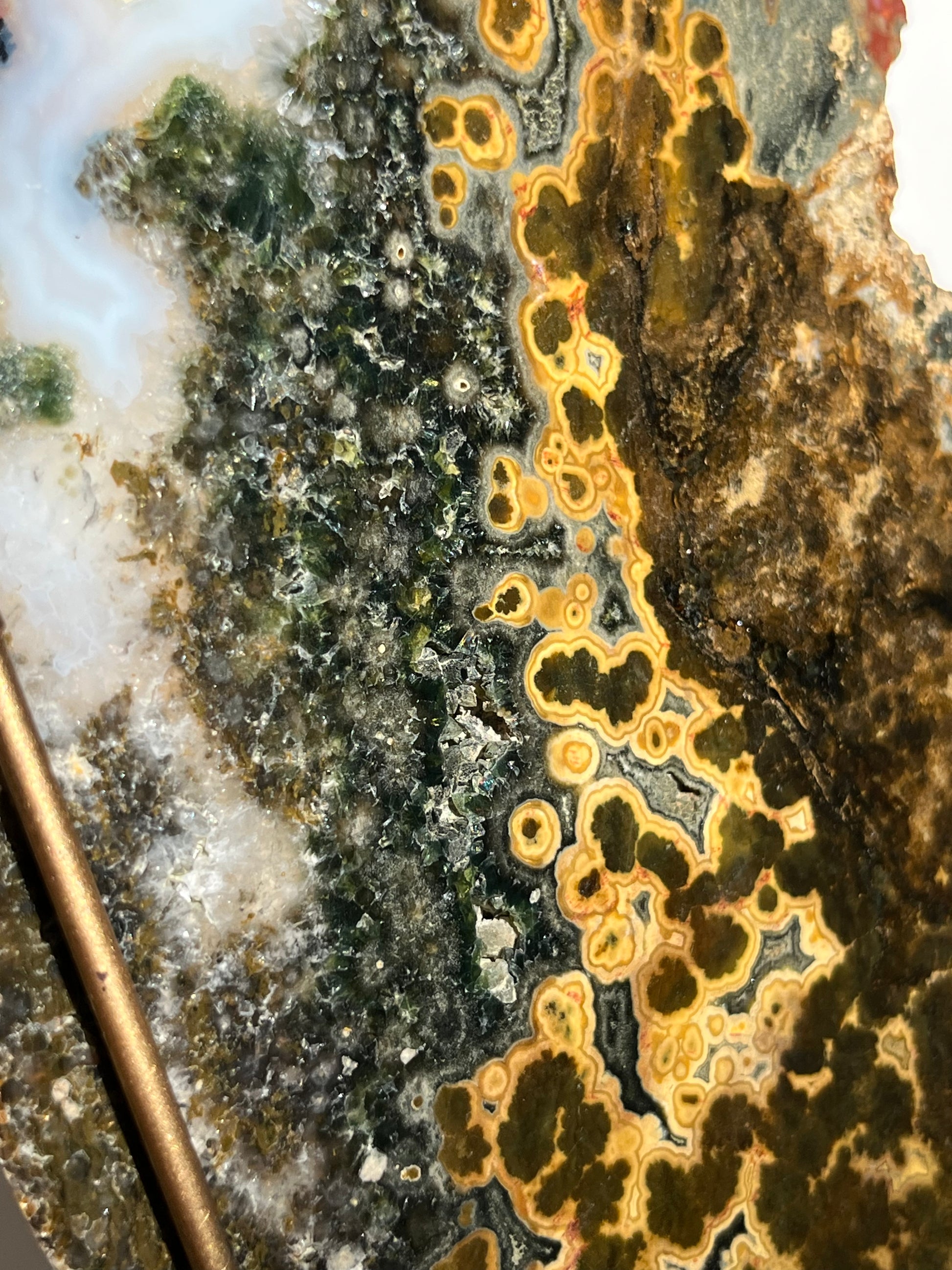 Multicoloured River Jasper Slab with Dendritic Inclusions on Rotating Gold Coloured Stand