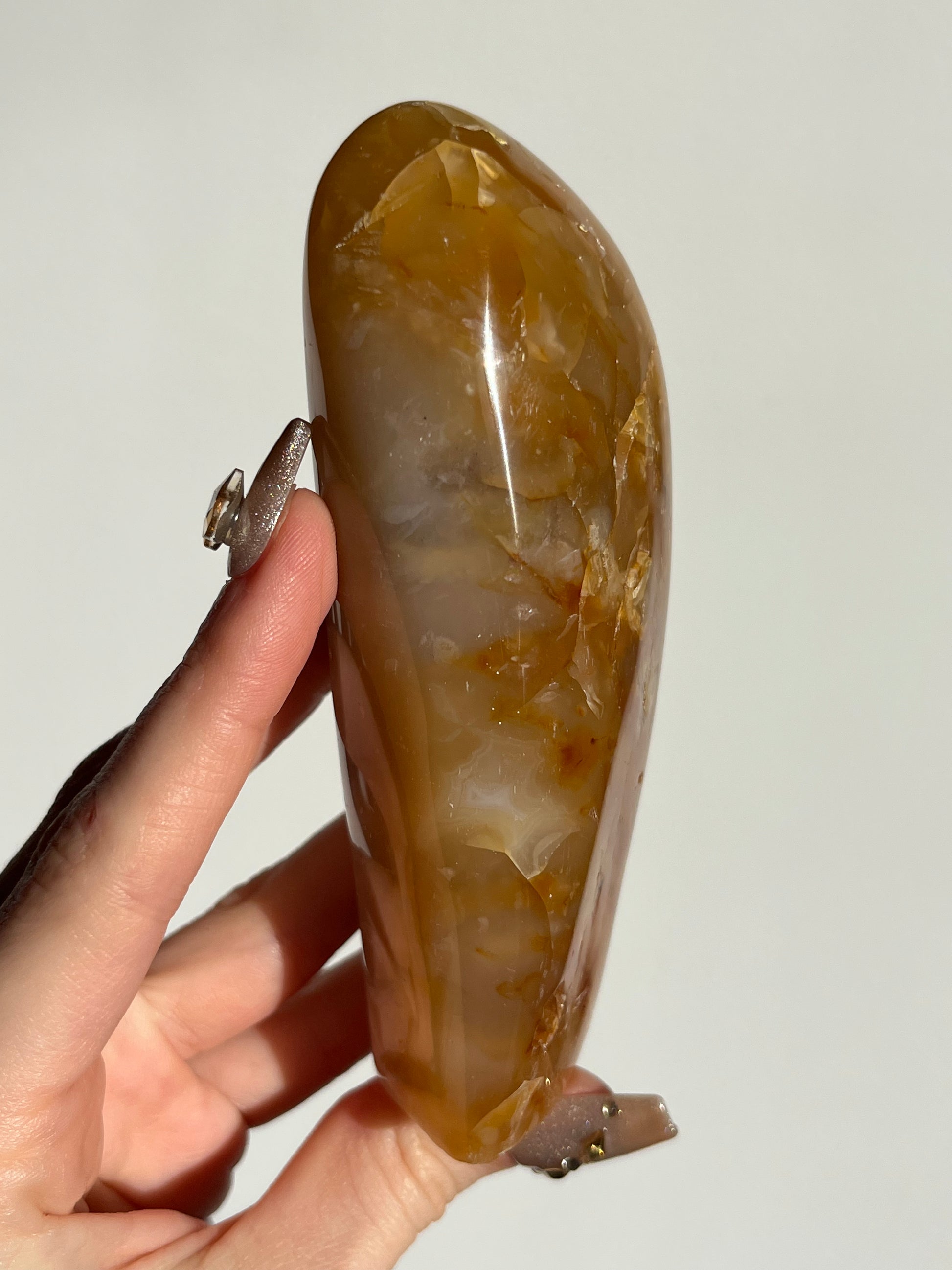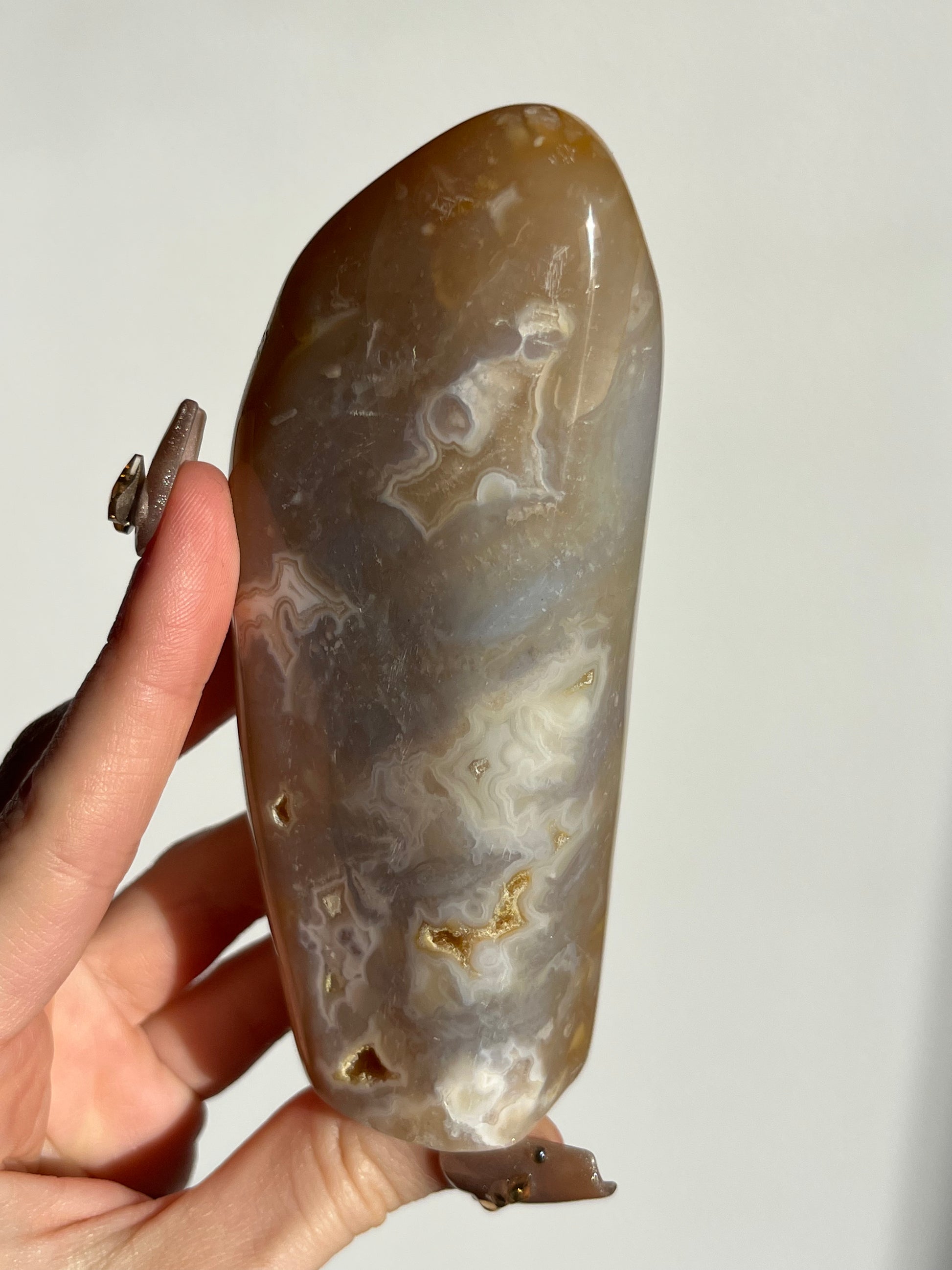 Soleia Agate is a radiant fusion of grounding, vitality, and emotional renewal. With inclusions of Snow Agate, Golden Hematoid, Carnelian, and Flower Agate, it harmonises inner strength with softness, supporting creative flow, self-trust, and heart-led action.