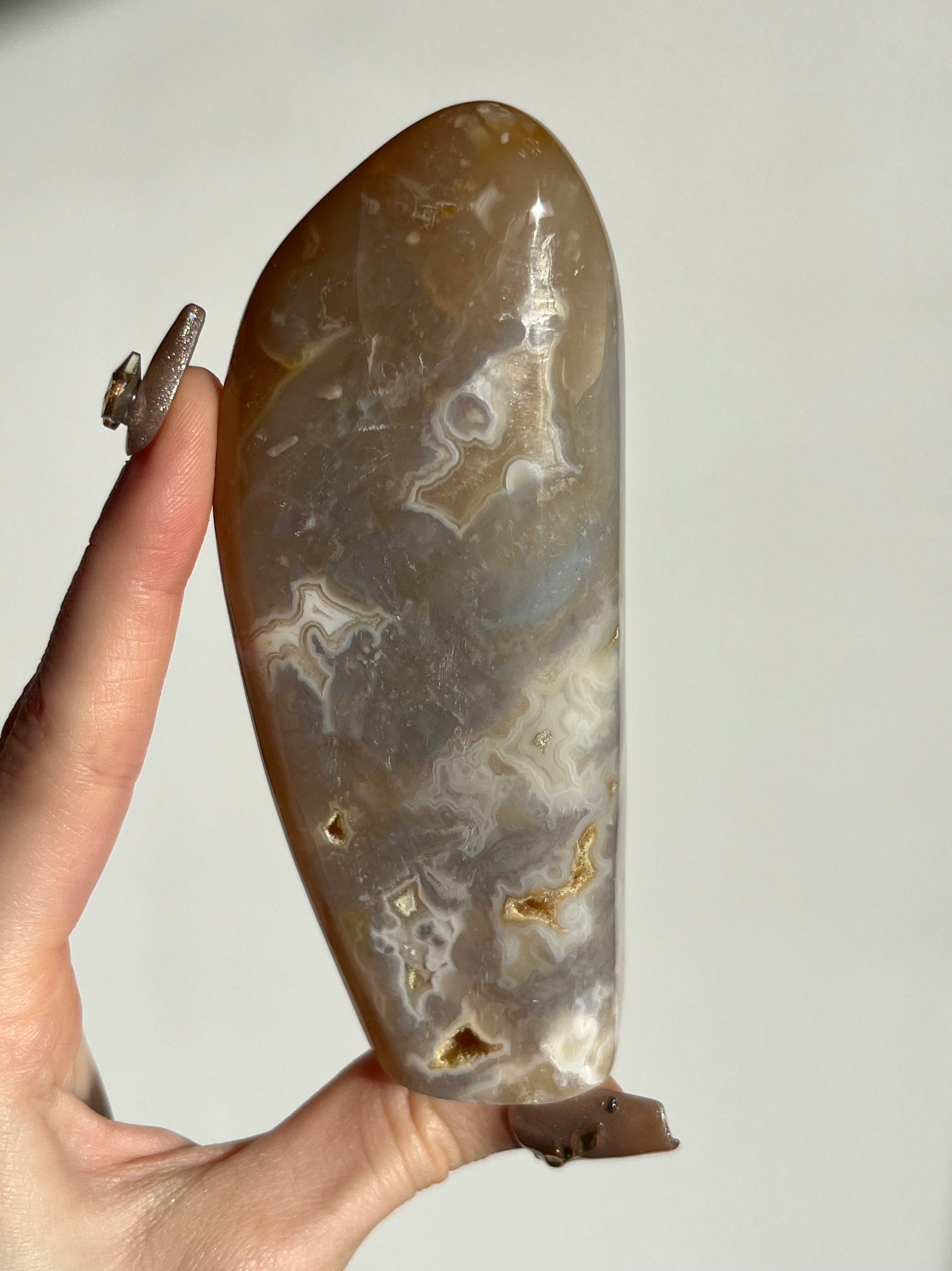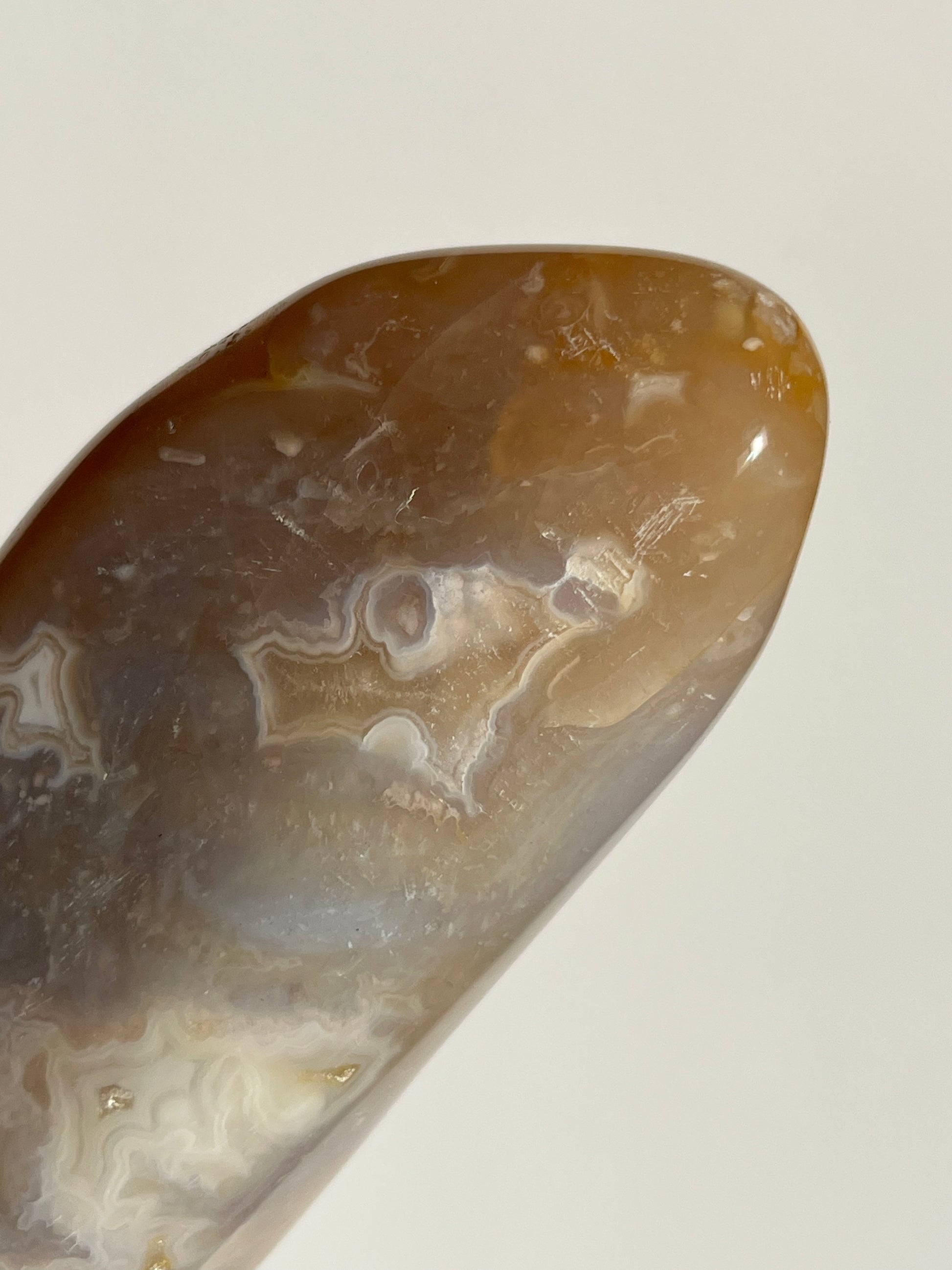 Soleia agate refers to this new variety of Indonesian snow agate with inclusions of golden healer quartz, carnelian and flower agate.