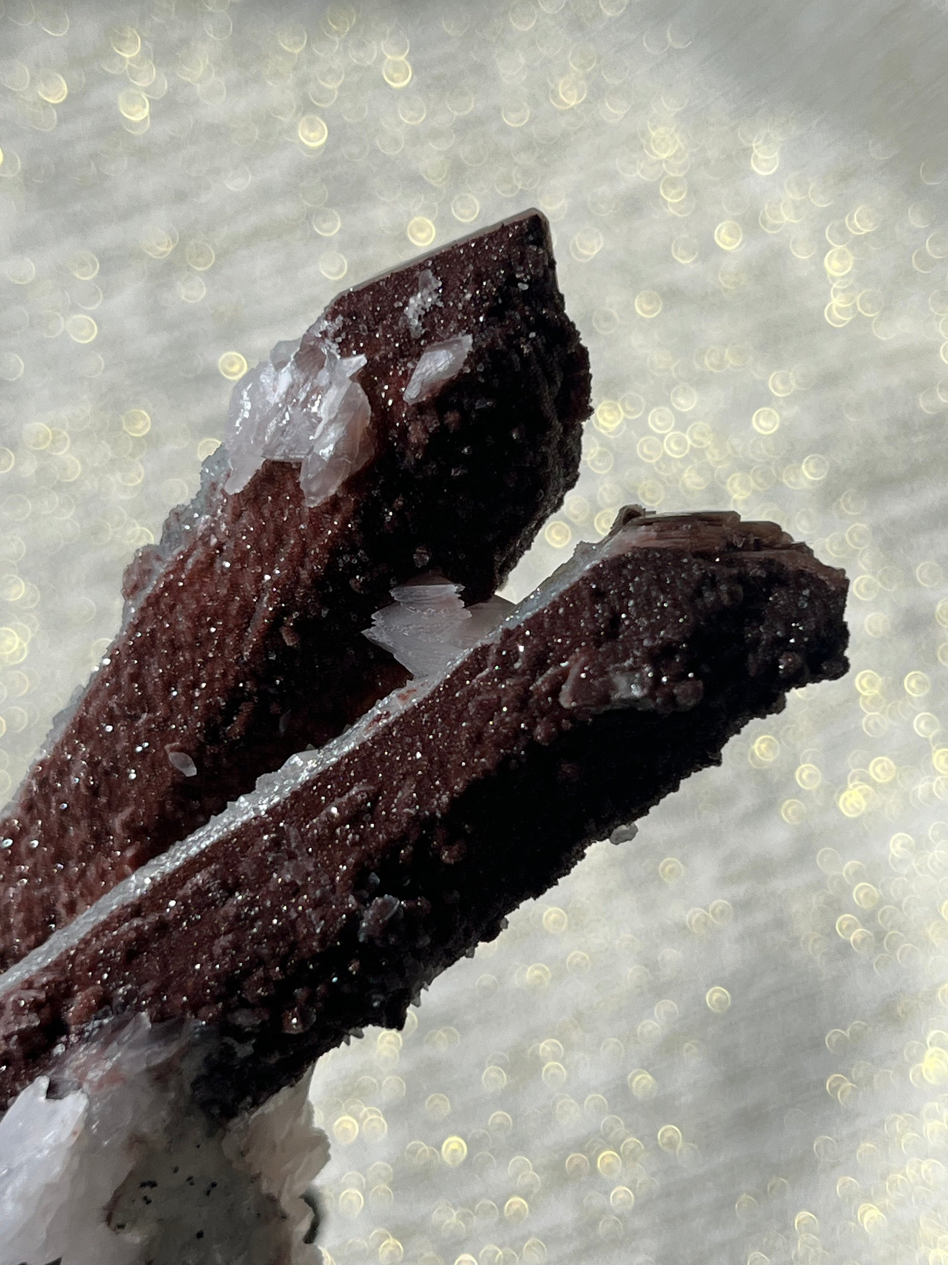 This rare pairing from Huanggangliang Mine is prized for its ethereal contrast. Deep plum toned quartz accented by delicate pink calcite blooms. A highly desirable and visually exquisite specimen for refined collectors.