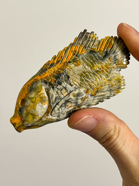 ‘Bee-trice’ Old Stock Orbicular Bumblebee Jasper Fish Carving (Self-standing)