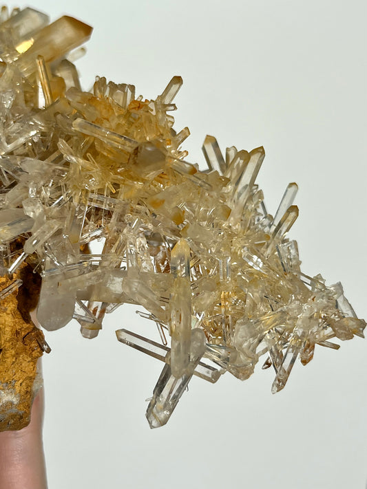 菱铁矿基质上的“反重力”芒果石英簇(大柜标本)