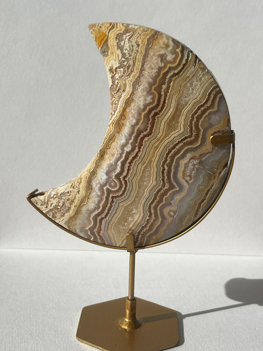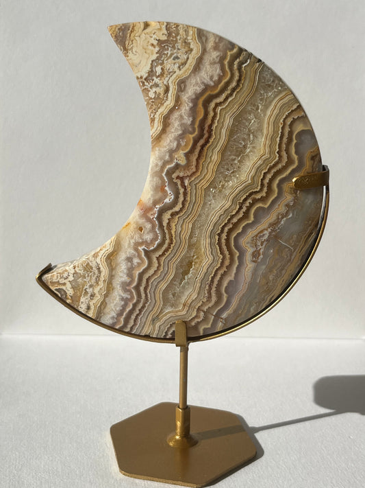 High Grade Golden Lace Agate Moon Carving on Stand with Parallax Effect B