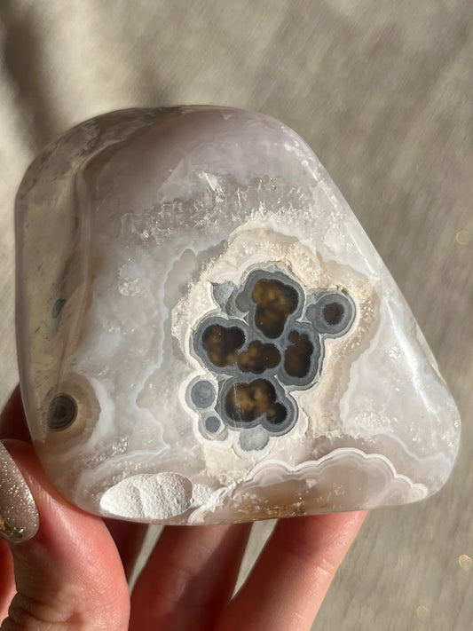 High Grade Golden Lace Agate Moon Carving on Stand with Parallax Effect A
