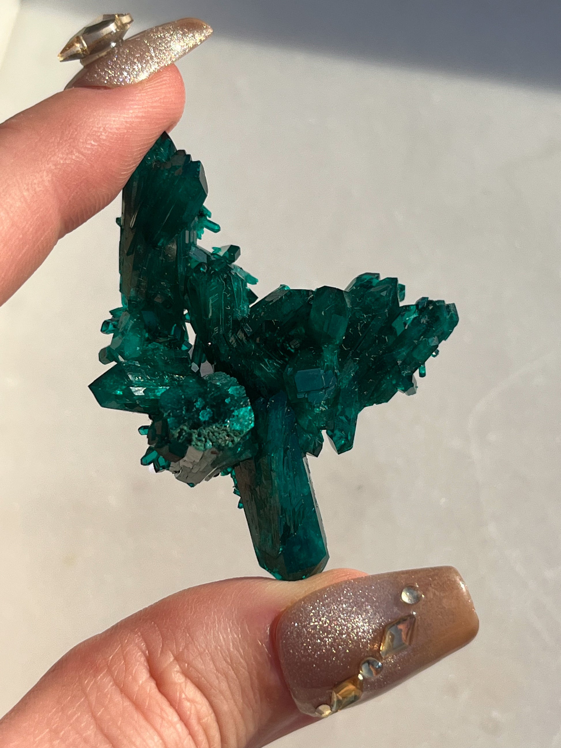 An exceptional cabinet specimen that features wonderfully large & terminated Dioptase crystal points. The inherent allure of this specimen is accentuated by its deeply vibrant emerald green colour and lustrous terminations.