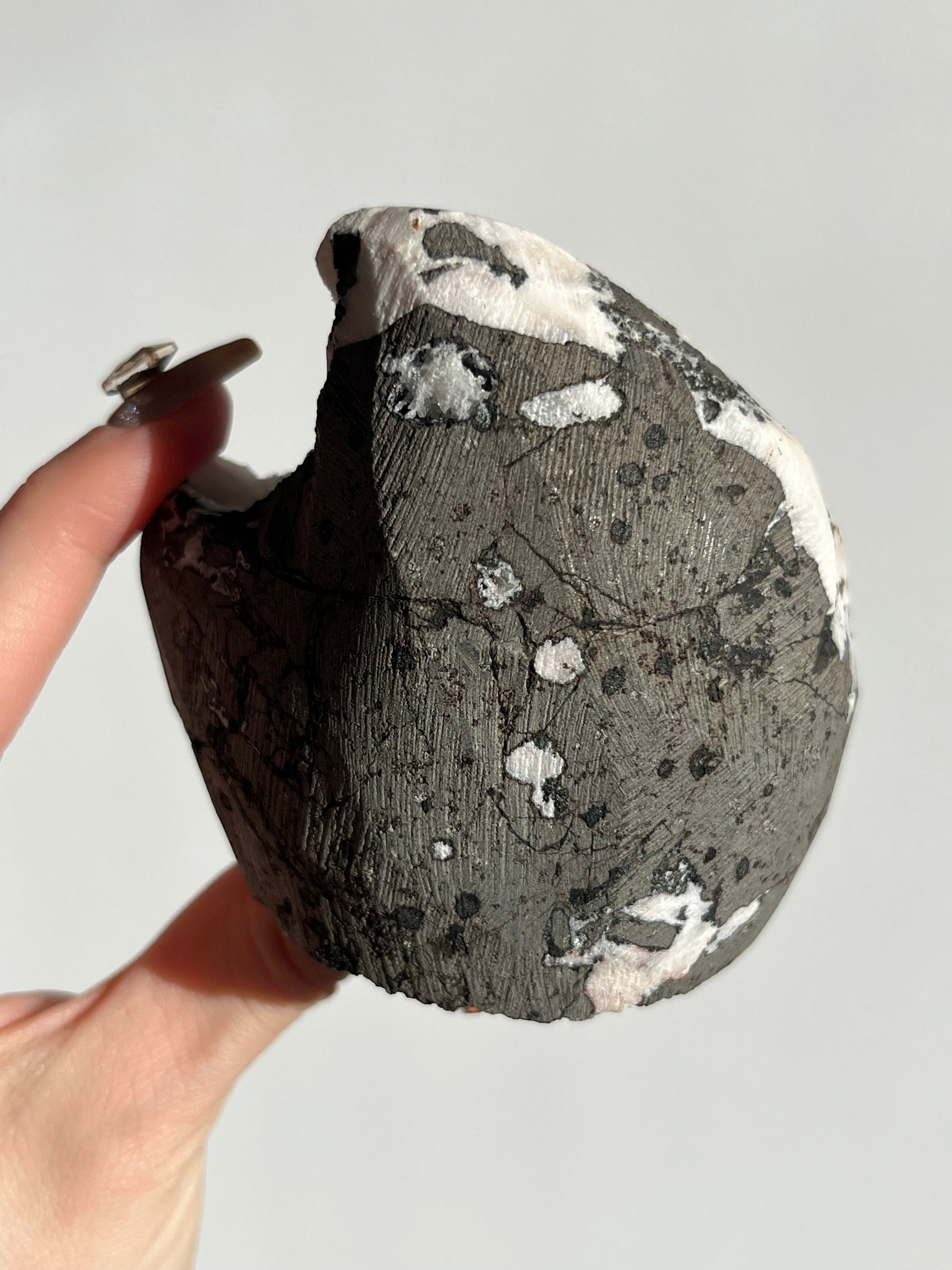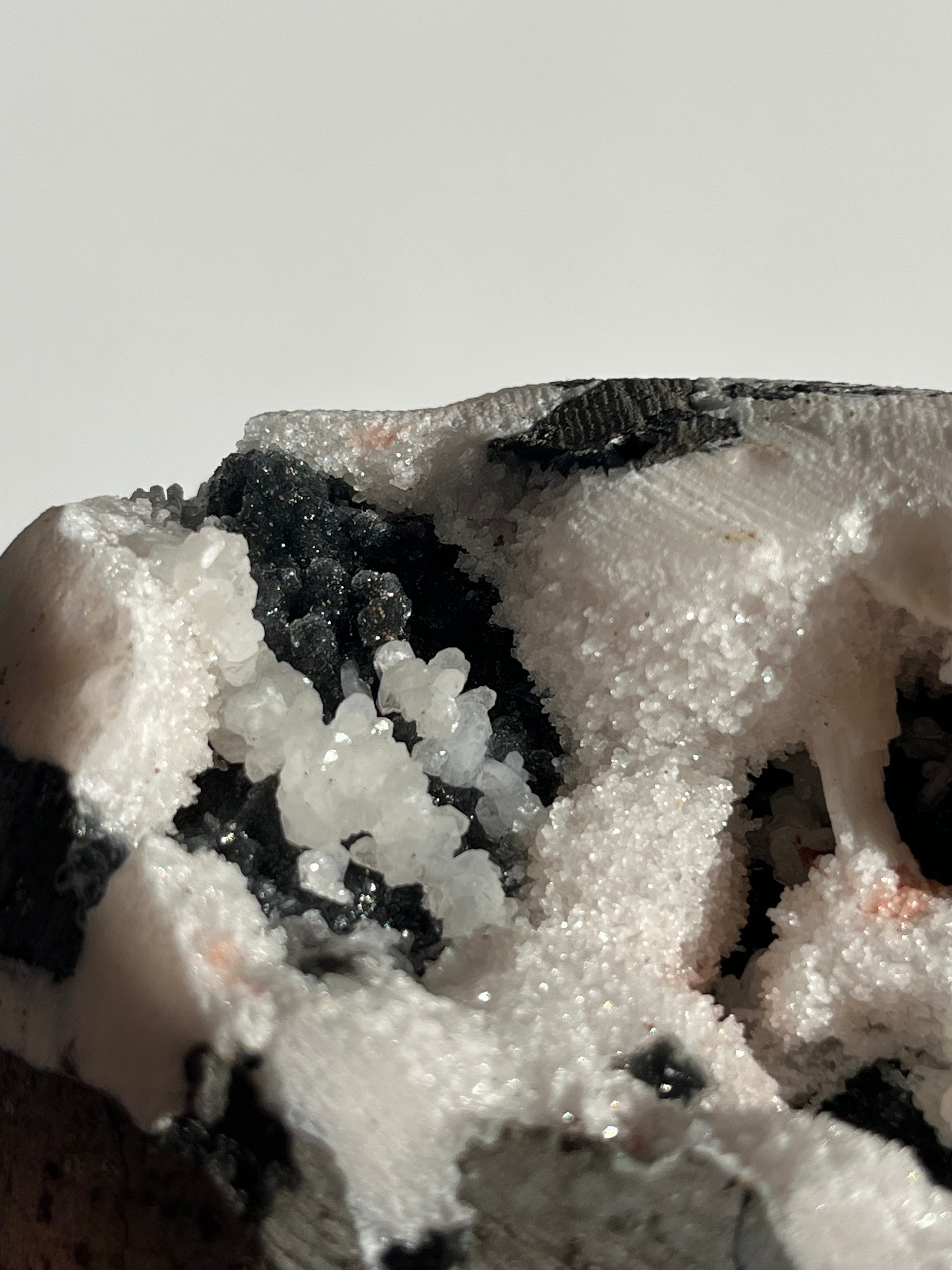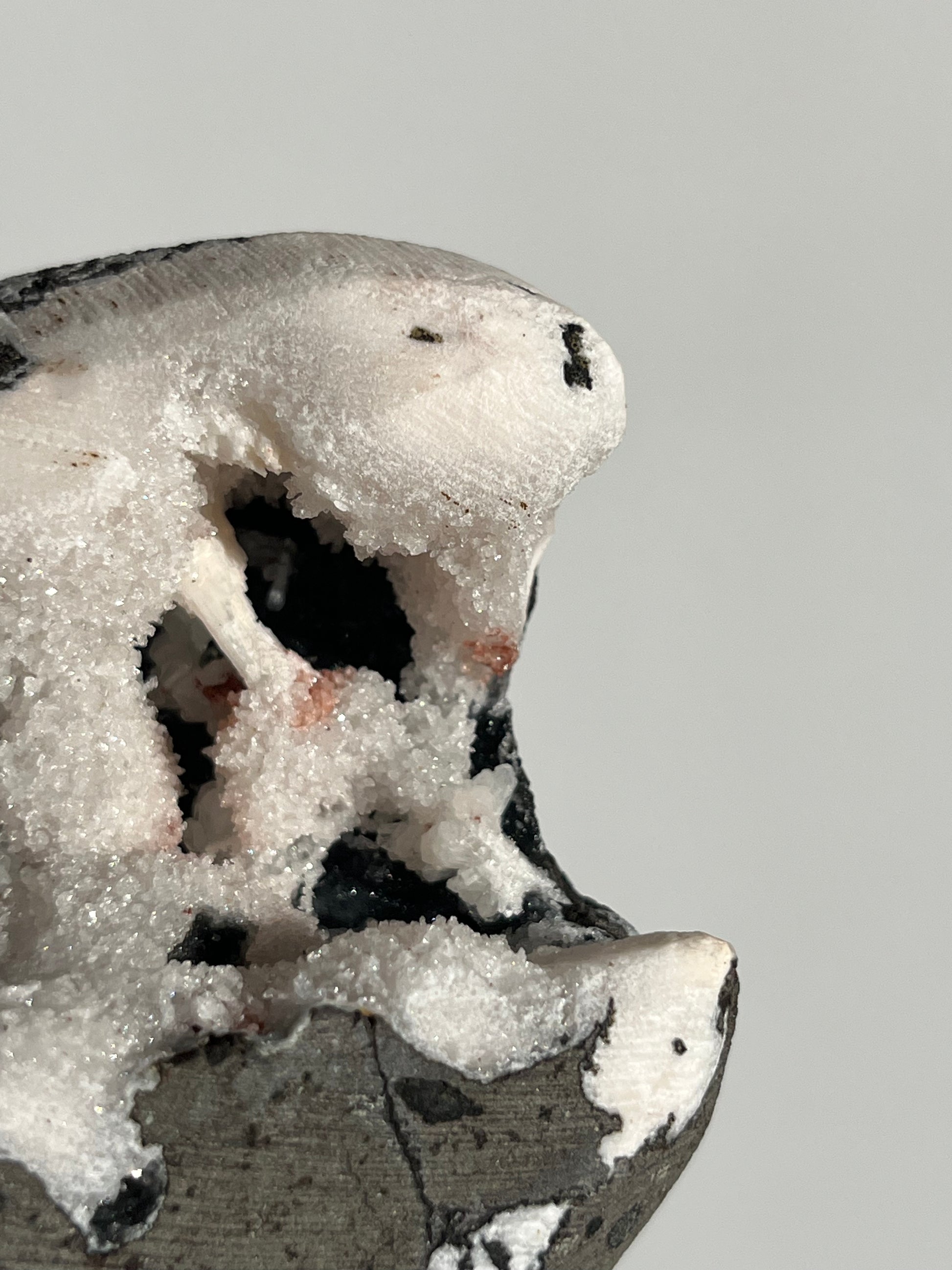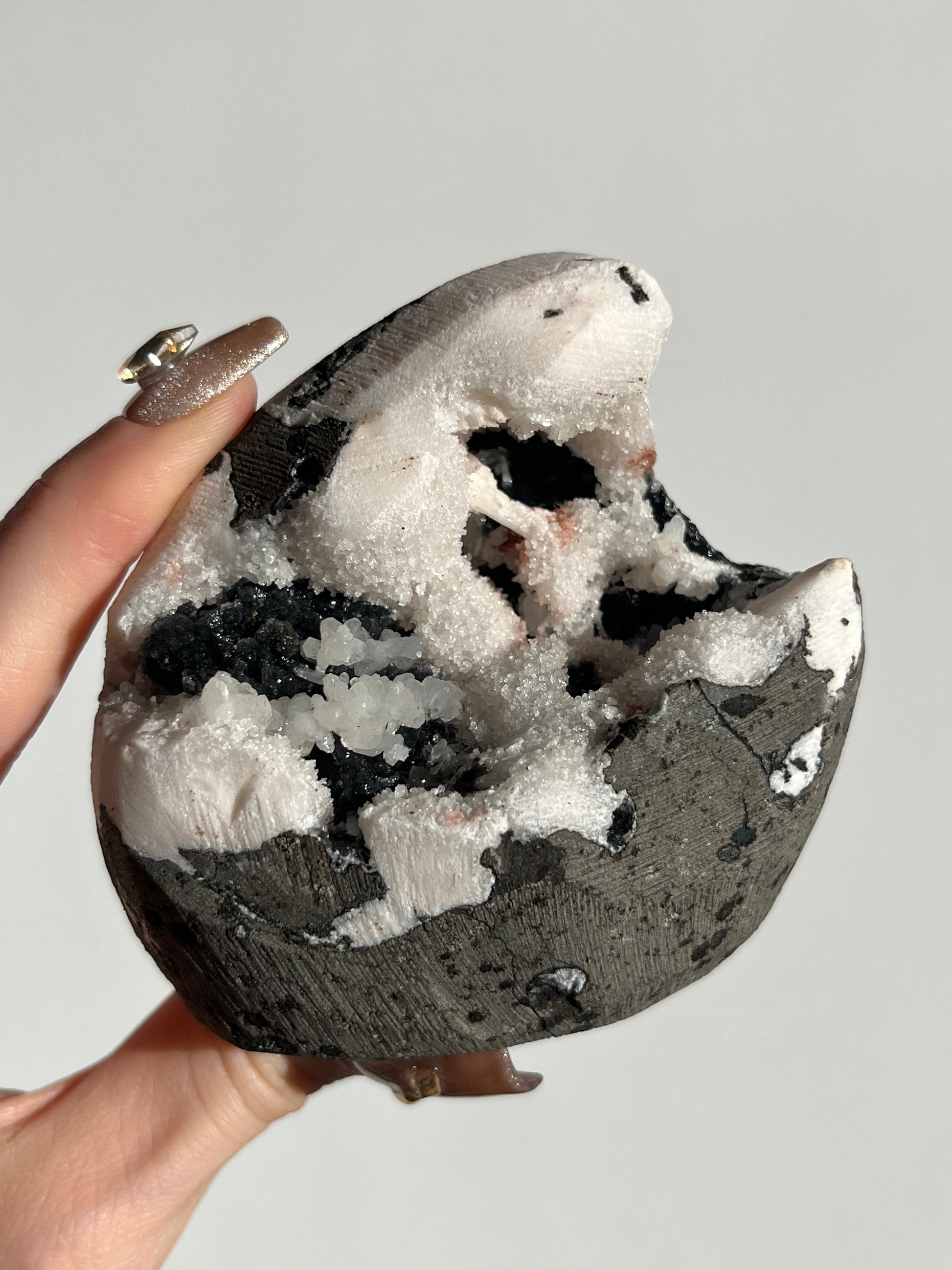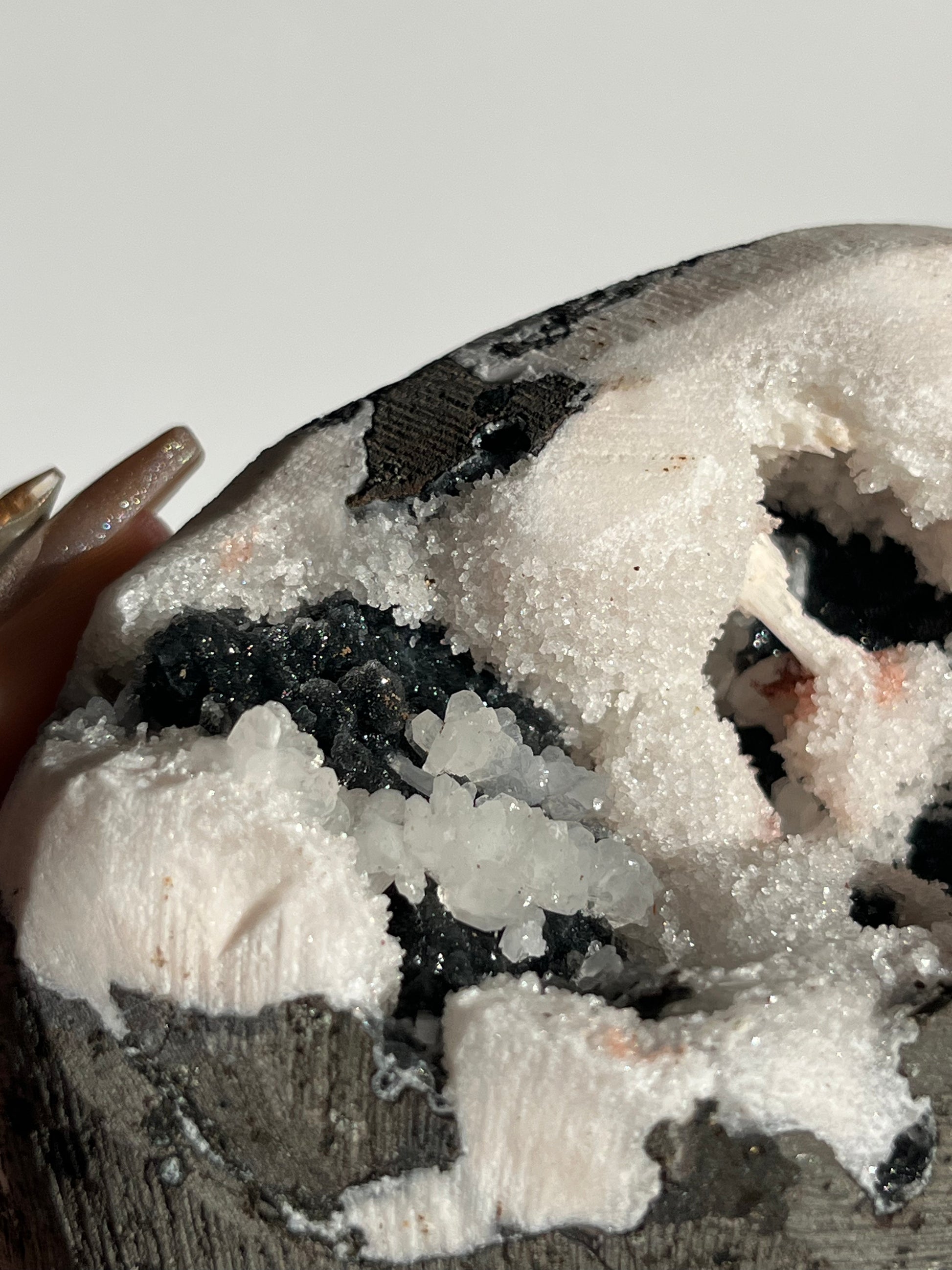 Black Chalcedony Geode Cave in Basalt with White Druzy Chalcedony and Stilbite H