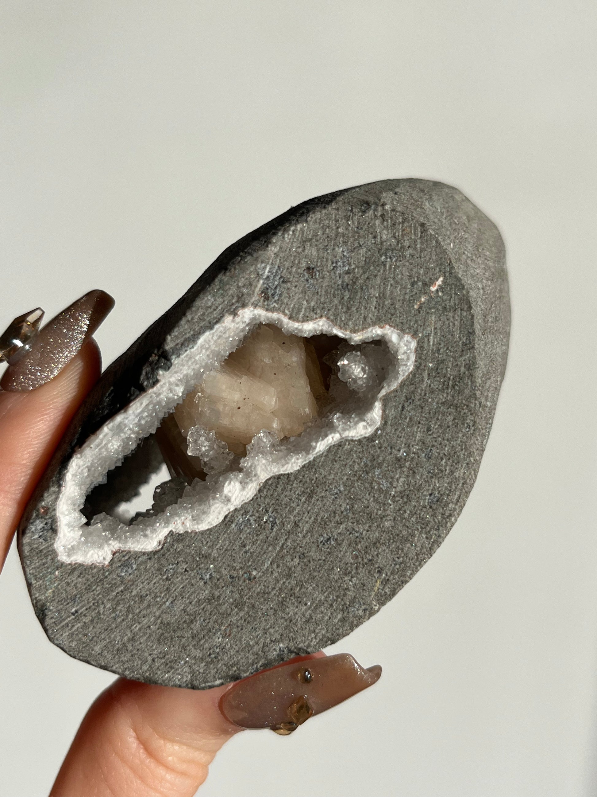 Stalactitic Apophyllite with Peach Stilbite Geode Cave in Basalt Z
