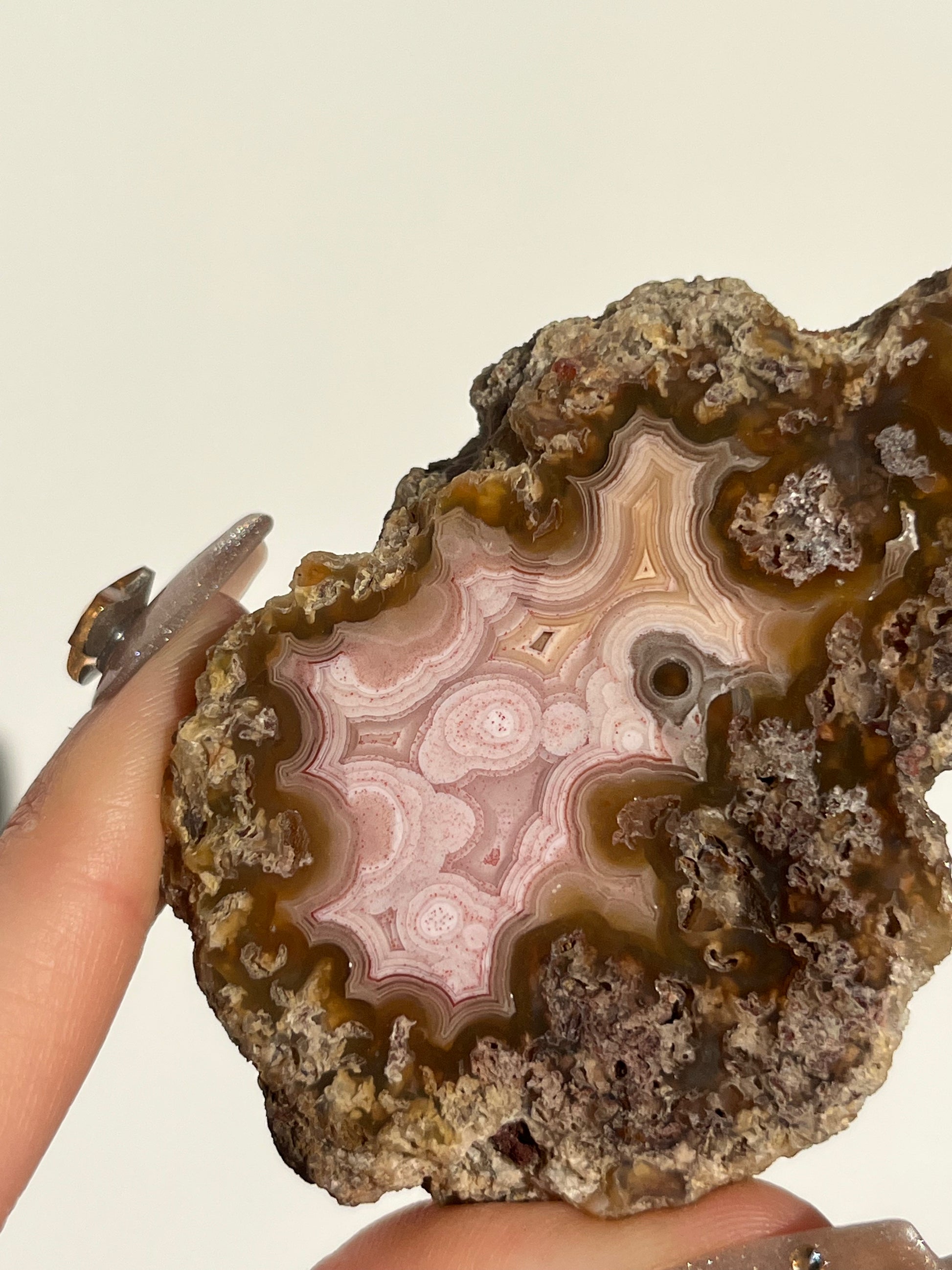 ‘Petal Blooms’ Baby Pink Agua Nueva Agate Geode with Moss Inclusions and Parallax Effect