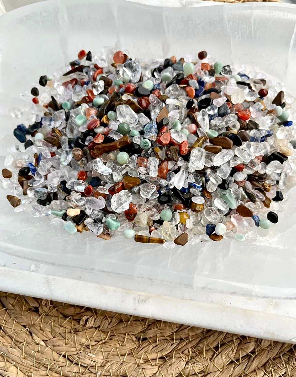 这款仙女水晶混合物含有多种混合水晶,如印度绿东陵石、青金石、马达加斯加透明和玫瑰石英、非洲虎眼石、红碧玉等。