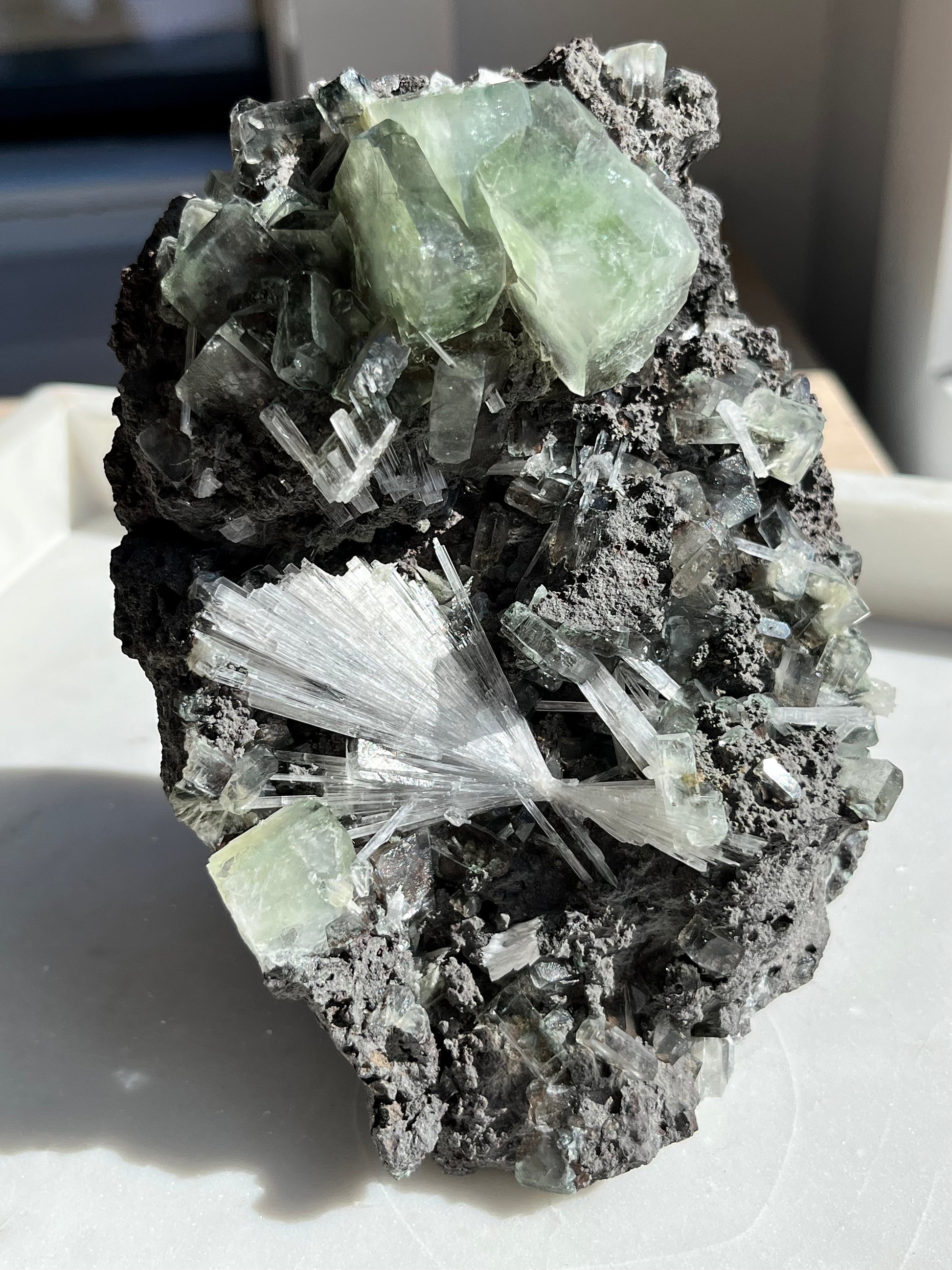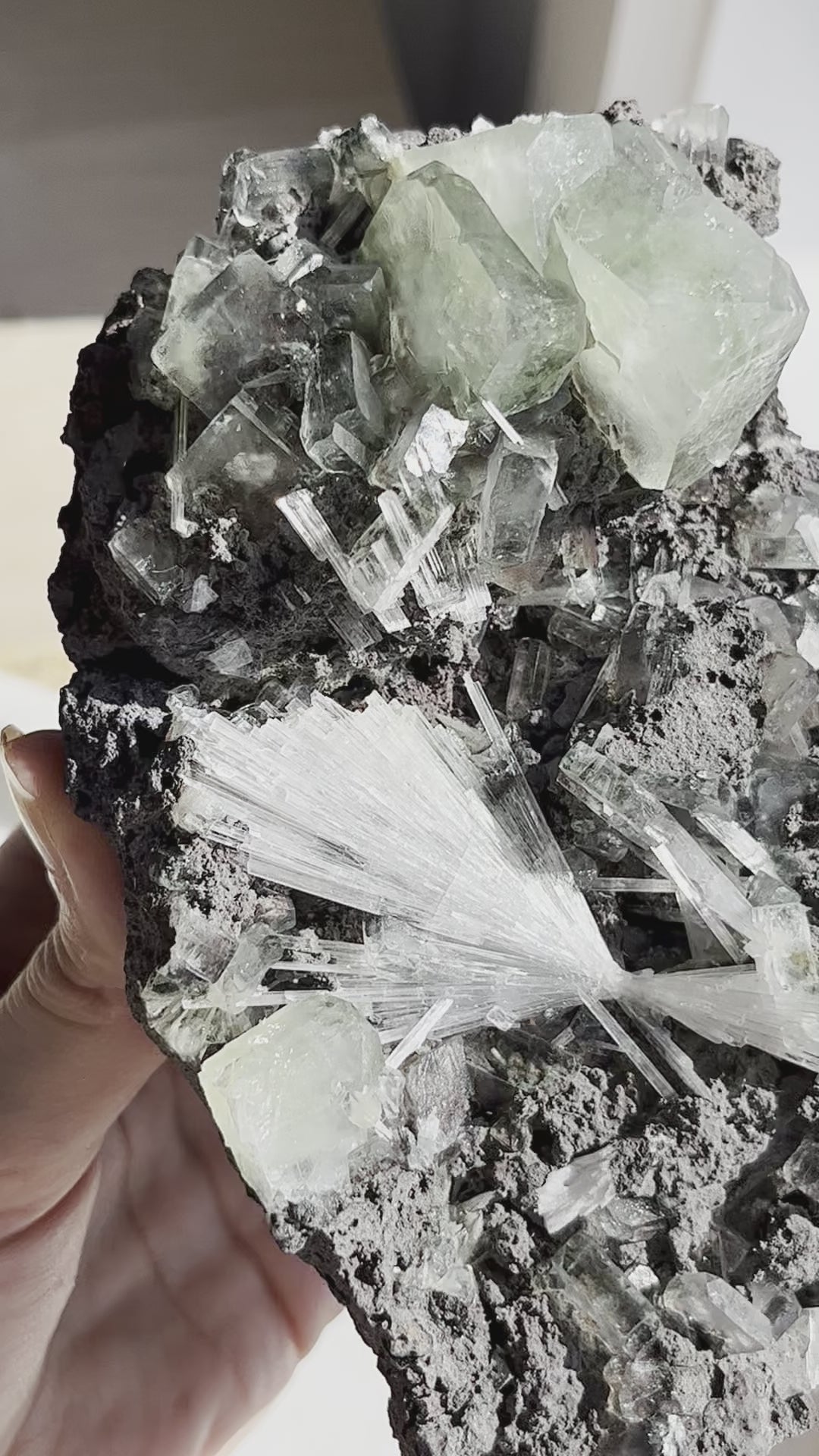 单独的绿色鱼鱼眼石并不是一种稀有的晶体。然而,当与冰骨石喷雾剂结合使用时,我们正在处理一些极其罕见的标本。印度鱼眼石矿中的此类标本数量有限,这使得这种晶体组合不仅是一个罕见的发现,而且是一个非常令人兴奋的发现。