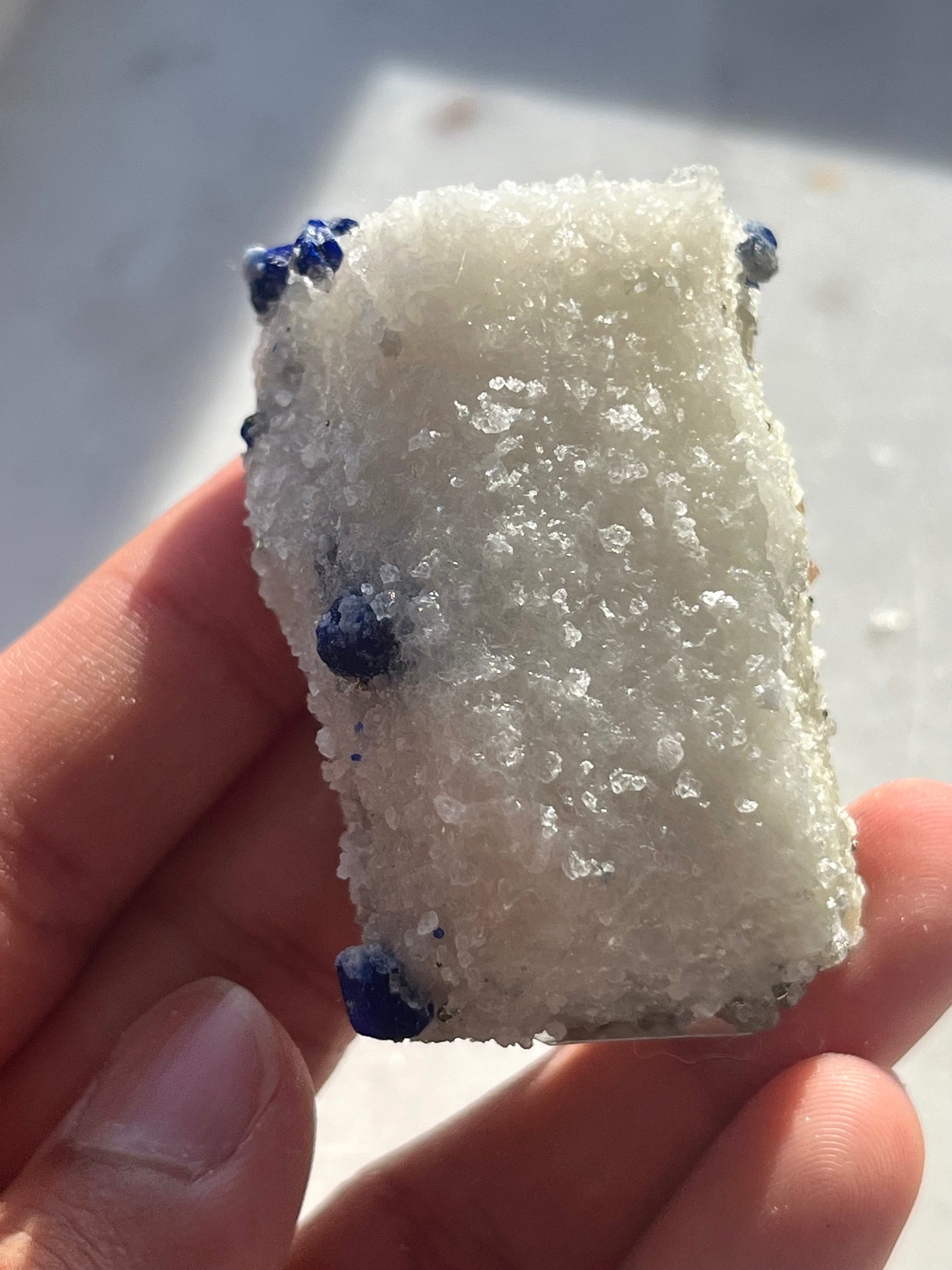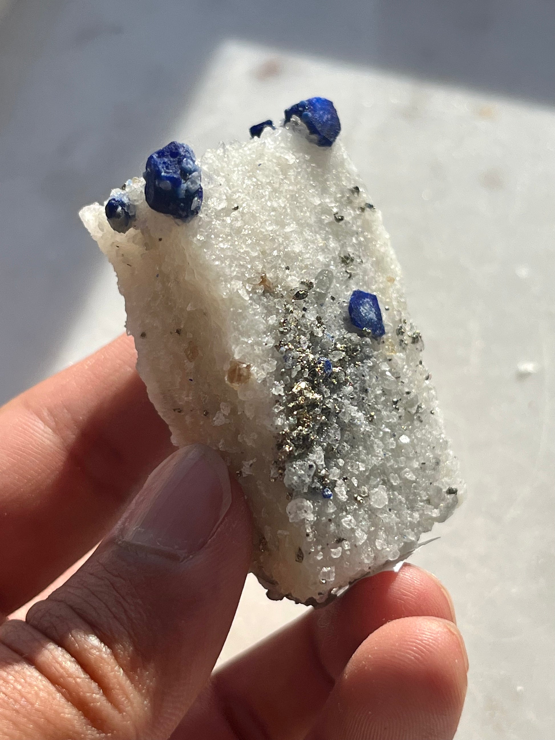 大理石上的“蓝莓”青金石、方解石和黄铁矿标本 #8
