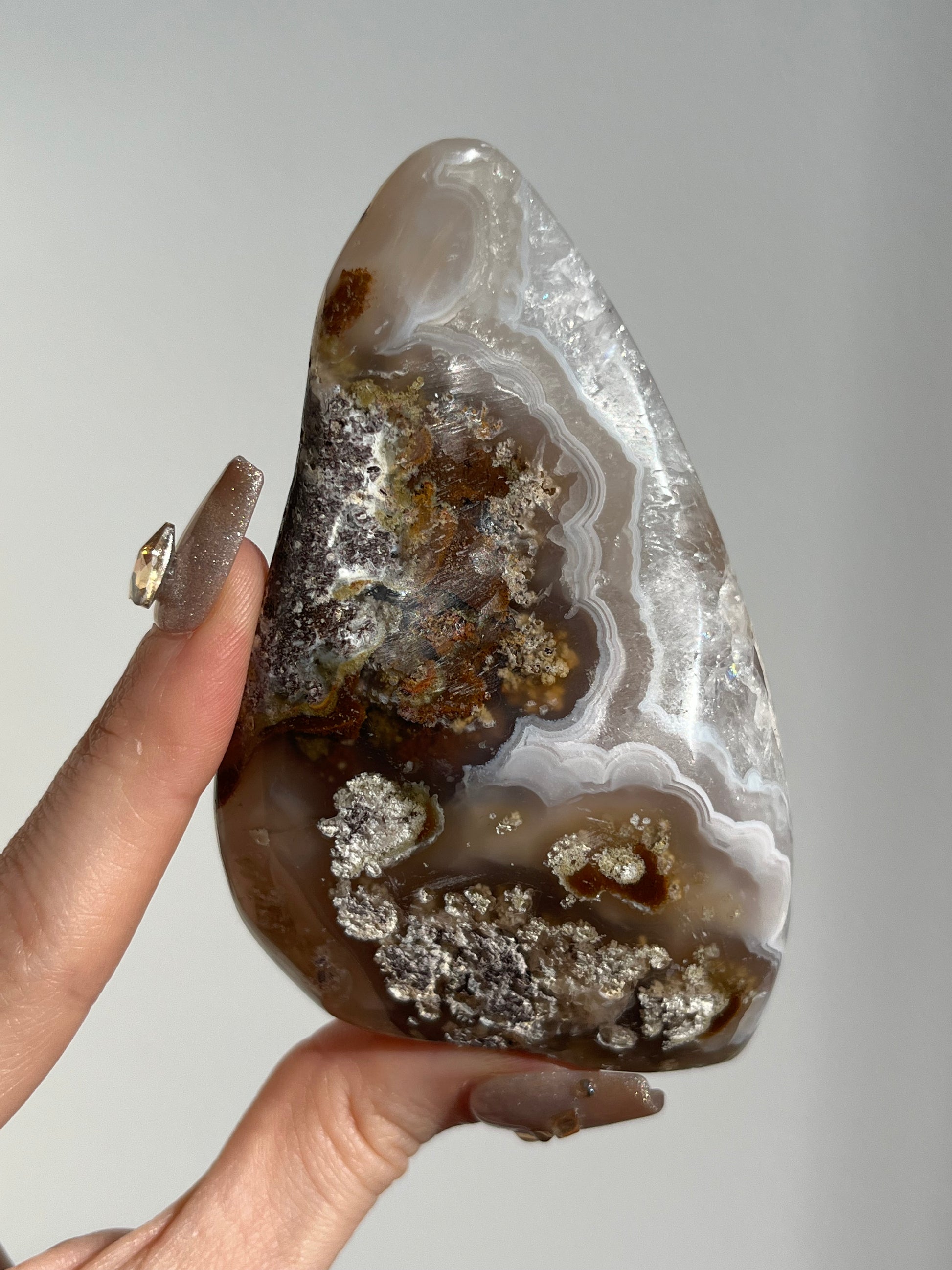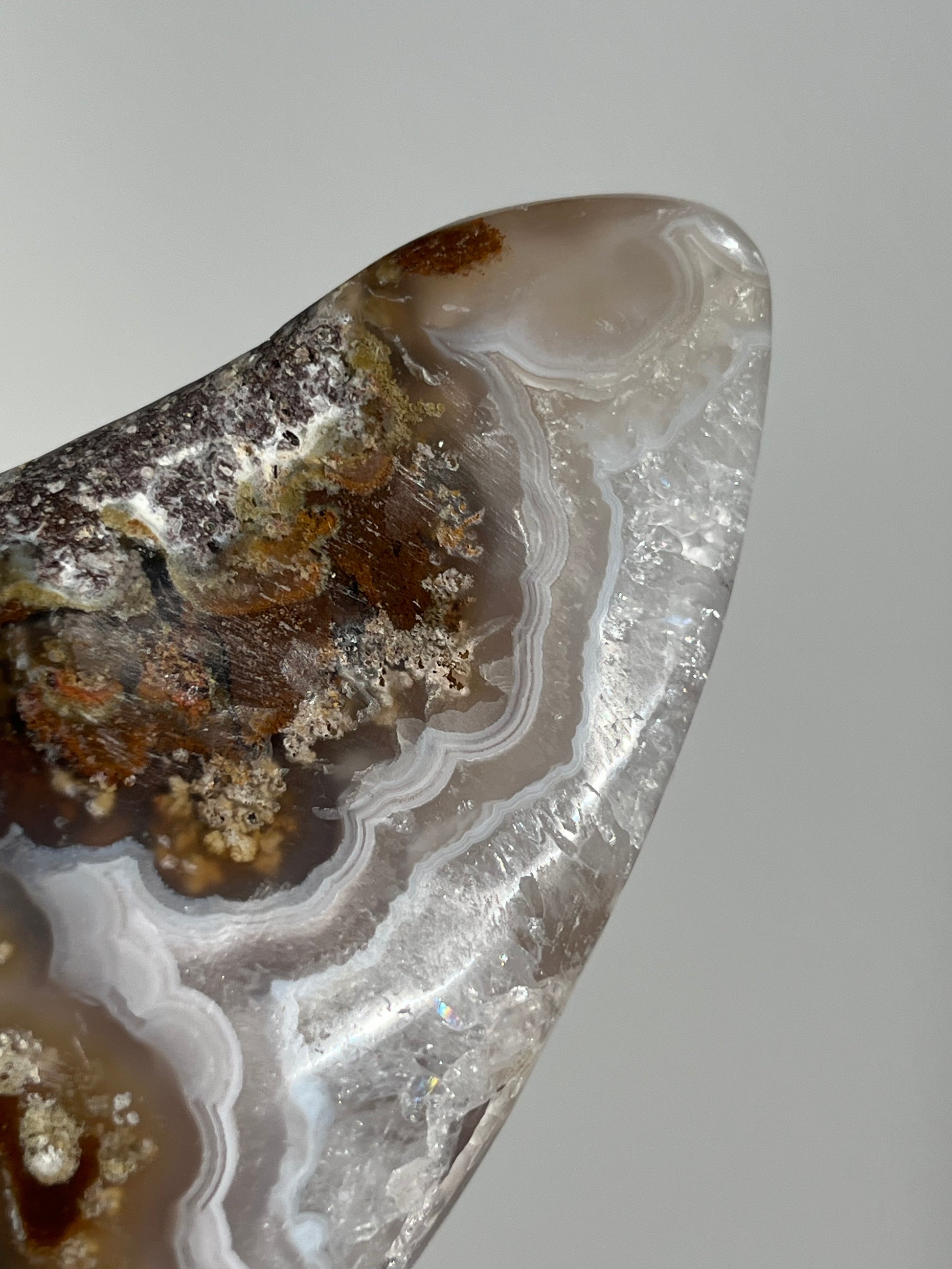 Nebula Agate is a new find from Indonesia first named by the founders of Priestess Crystals. With enchanting orbicular agate rings that pierce through a translucent chalcedony. Depending on how the stone is carved, multicoloured moss & dendritic inclusions can be present.