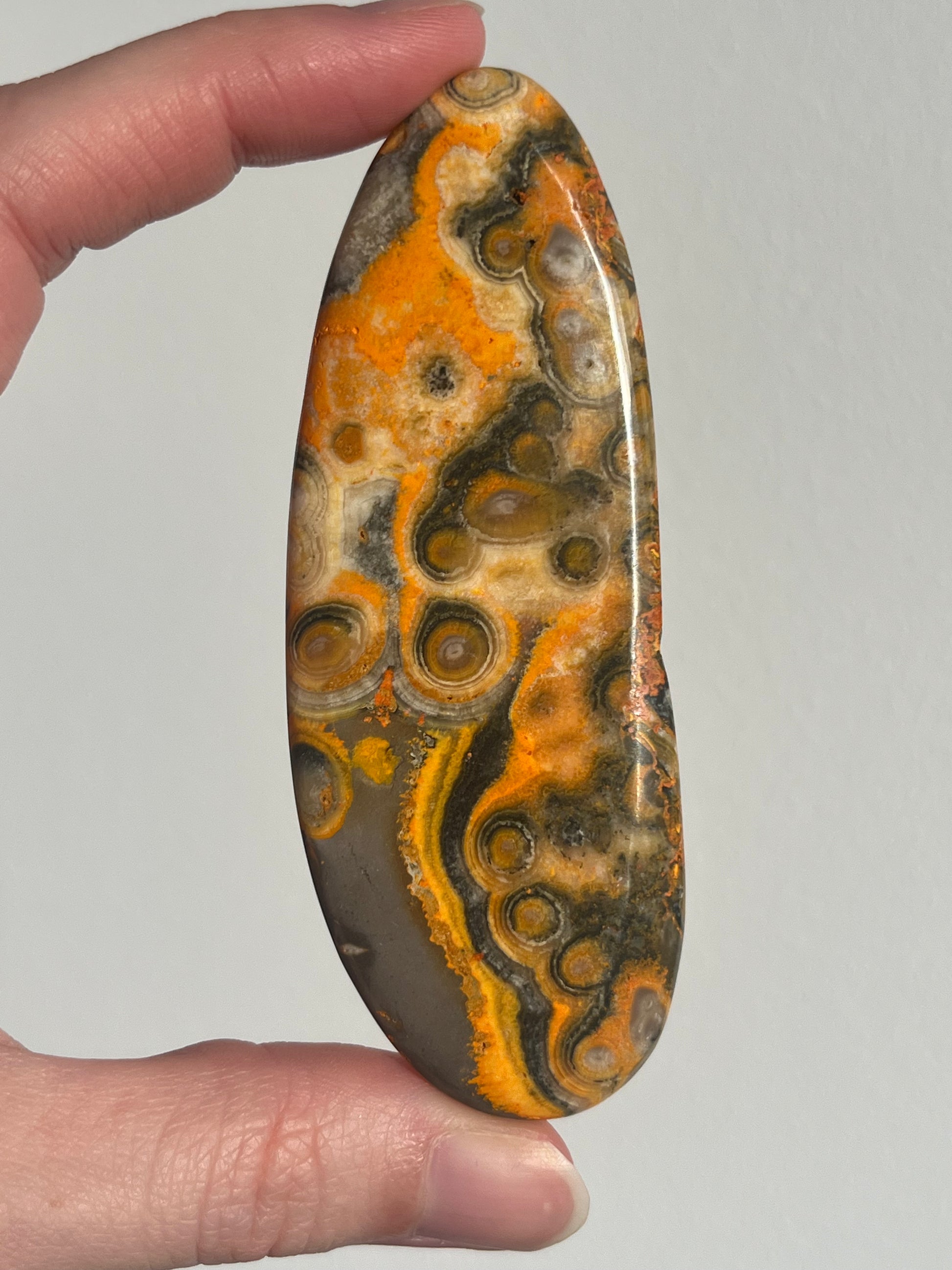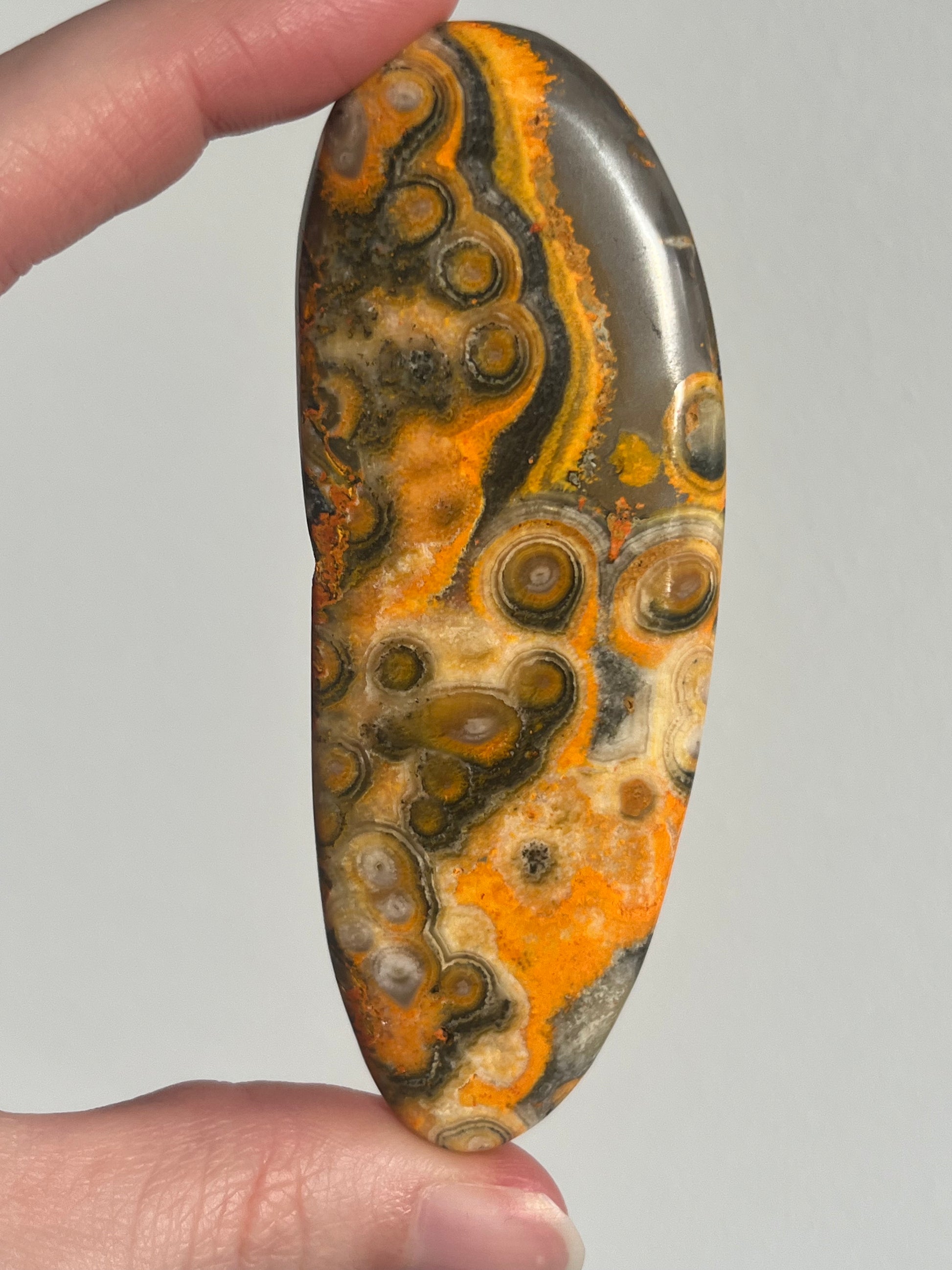 This Bumblebee Jasper is rare not only because of its orbicular patterning. This old stock variety was originally mined in 2016 and represents some of the best specimens of Orbicular Bumblebee Jasper on the market with deeply contrasted eye patterning set against a rich yellow-orange matrix.
