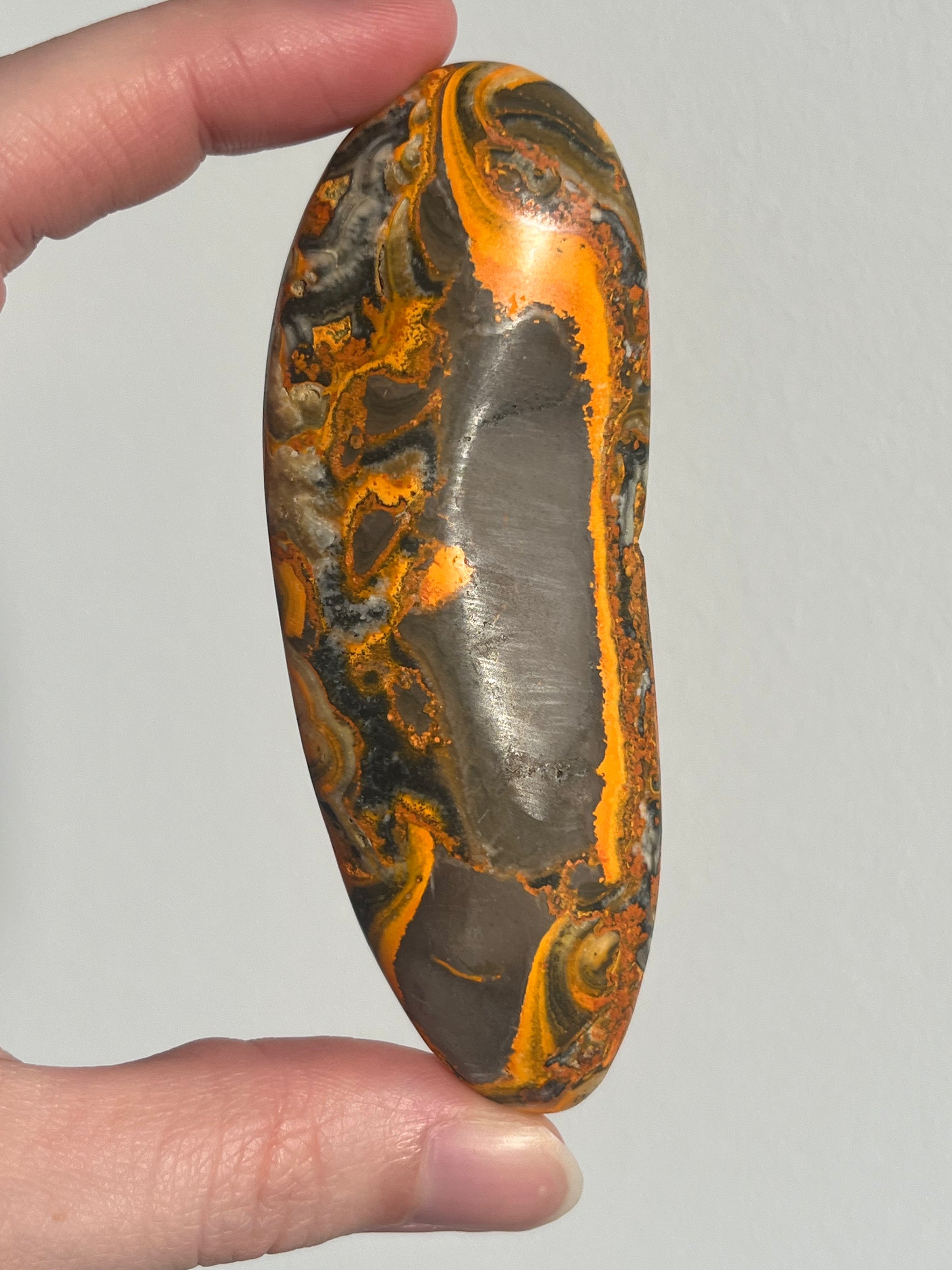 Bumblebee Jasper is formed as a result of volcanic activity in Mt Papandayan, Indonesia. The botryoidal formation (this polished orbicular piece) is old vein material which can be hard to come by. Very much a collector’s piece.