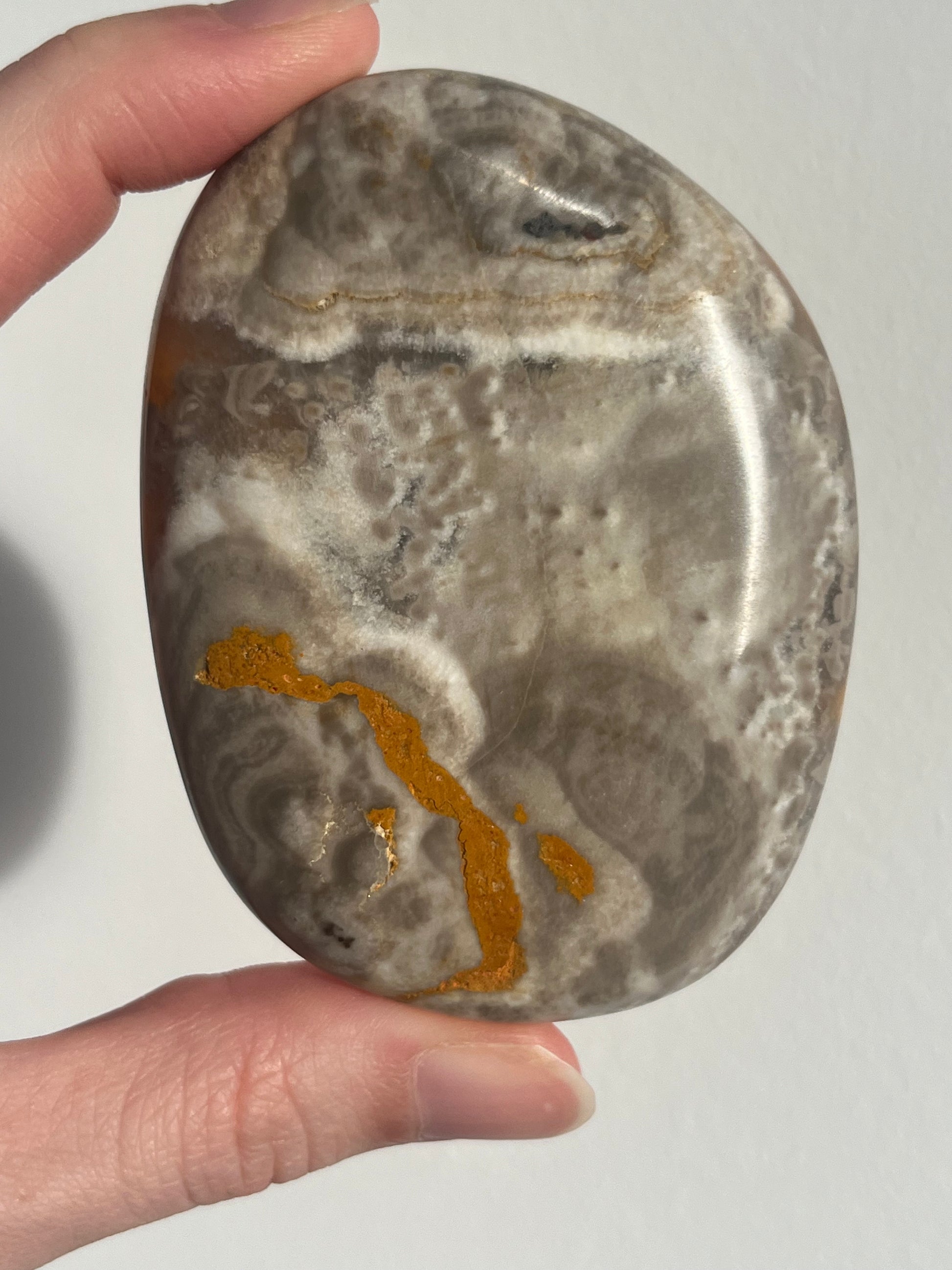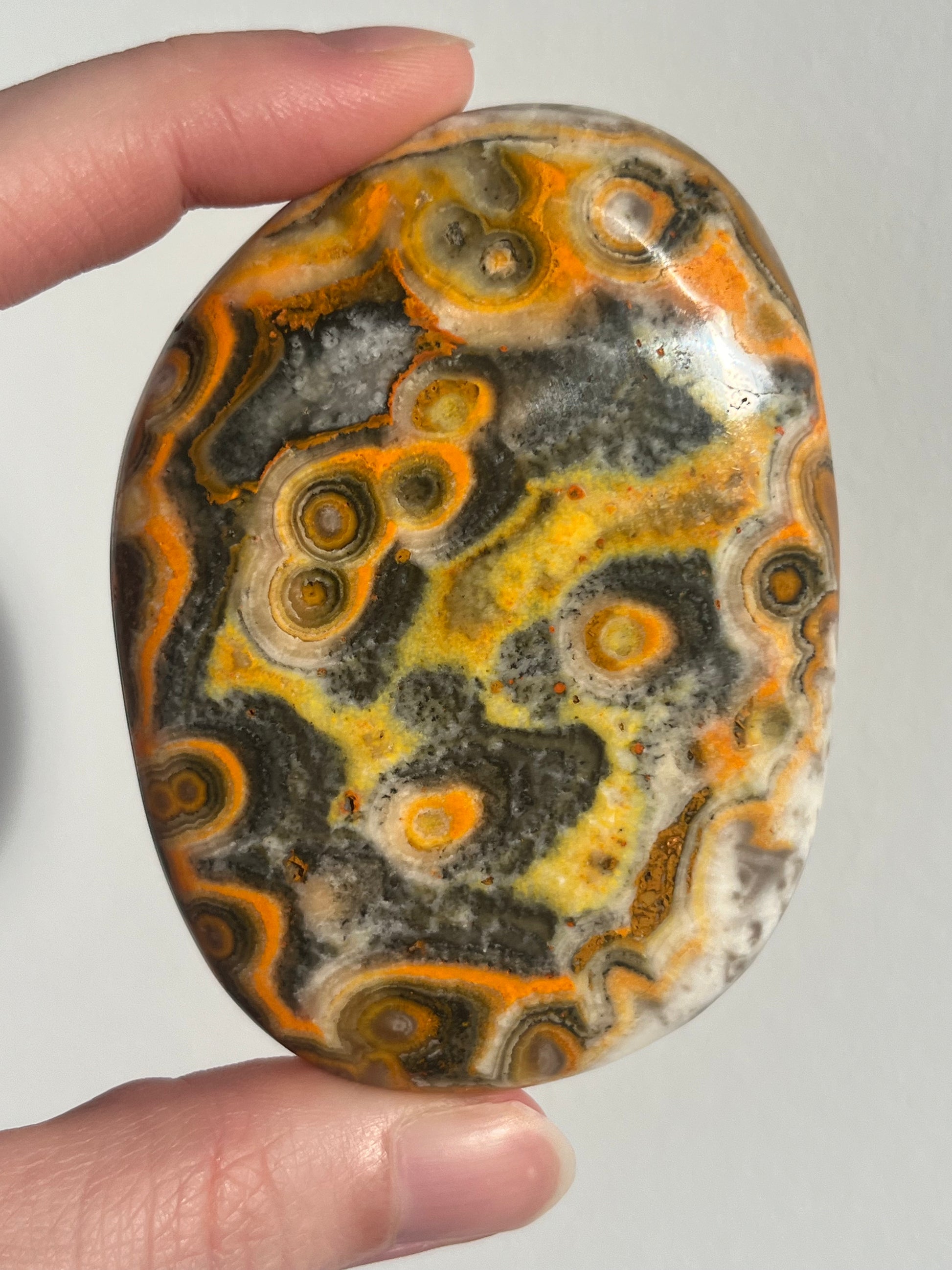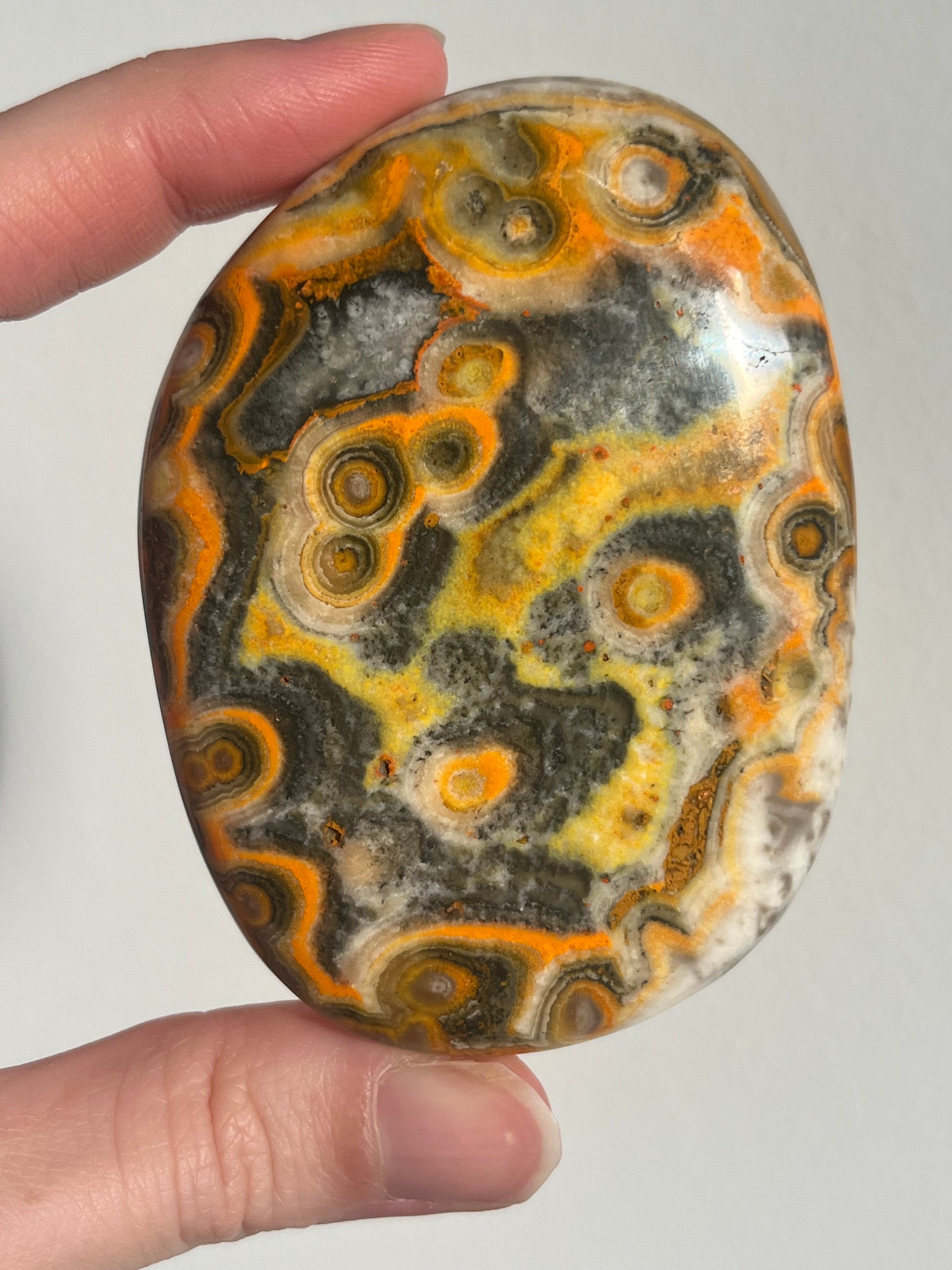 This Bumblebee Jasper is rare not only because of its orbicular patterning. This old stock variety was originally mined in 2016 and represents some of the best specimens of Orbicular Bumblebee Jasper on the market with deeply contrasted eye patterning set against a rich yellow-orange matrix.