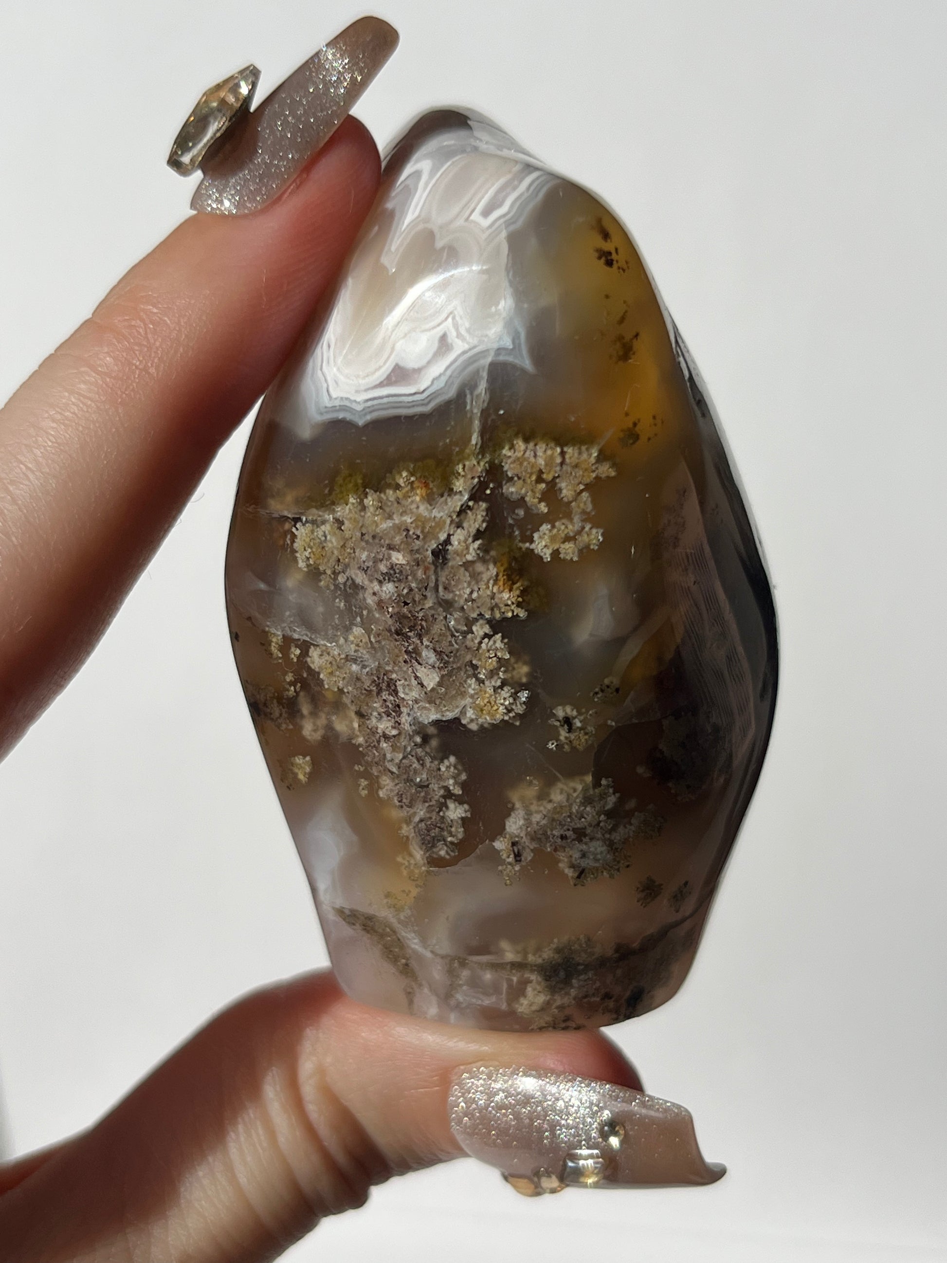 Nebula Agate is a recent find from Indonesia first named by the founders of Priestess Crystals. With enchanting multicoloured moss and orbicular agate rings that pierce through translucent chalcedony.
