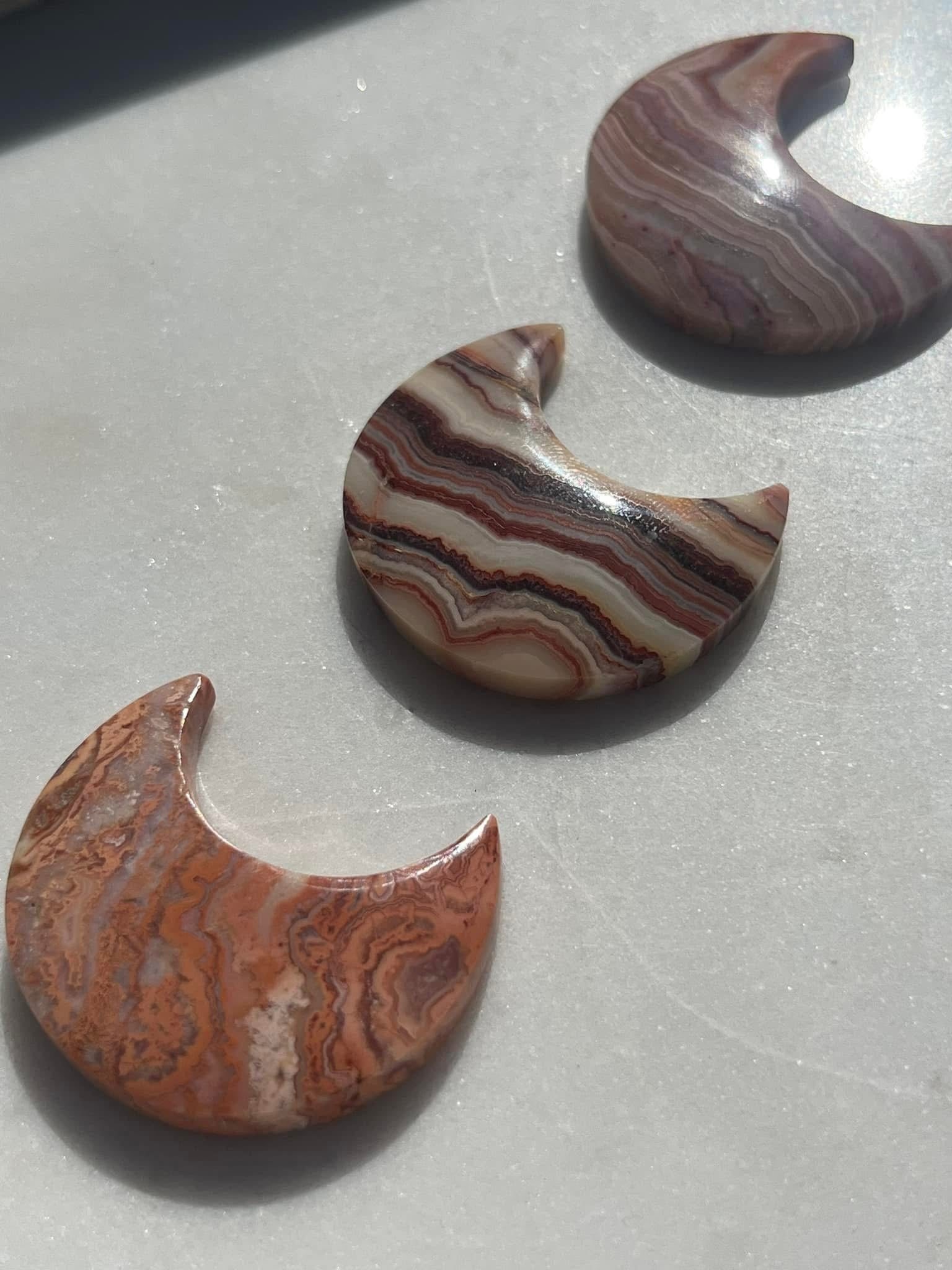 This pink variety of Crazy Lace Agate is heat treated. You will receive one intuitively chosen Pink Crazy Lace Agate Moon Carving.