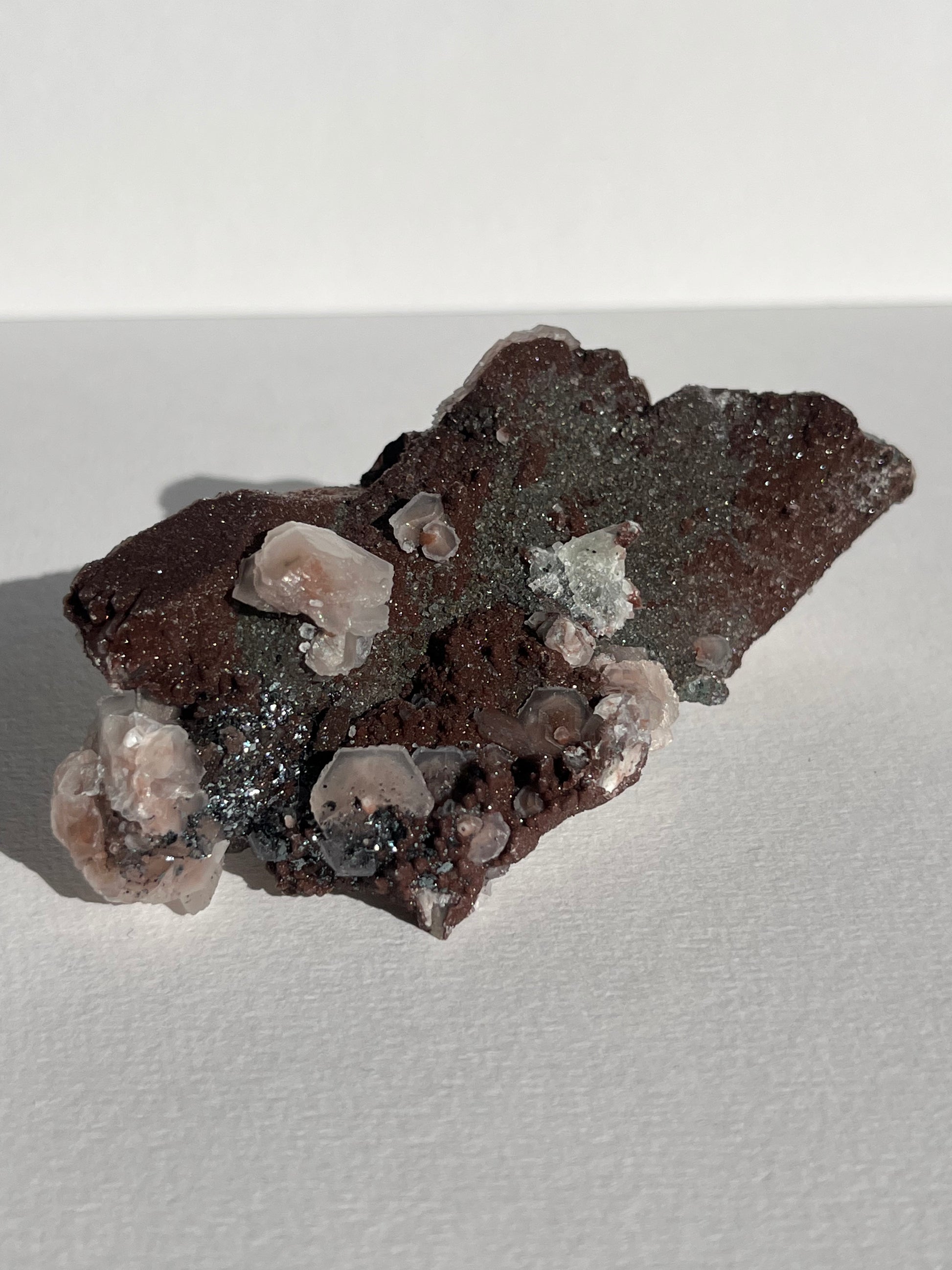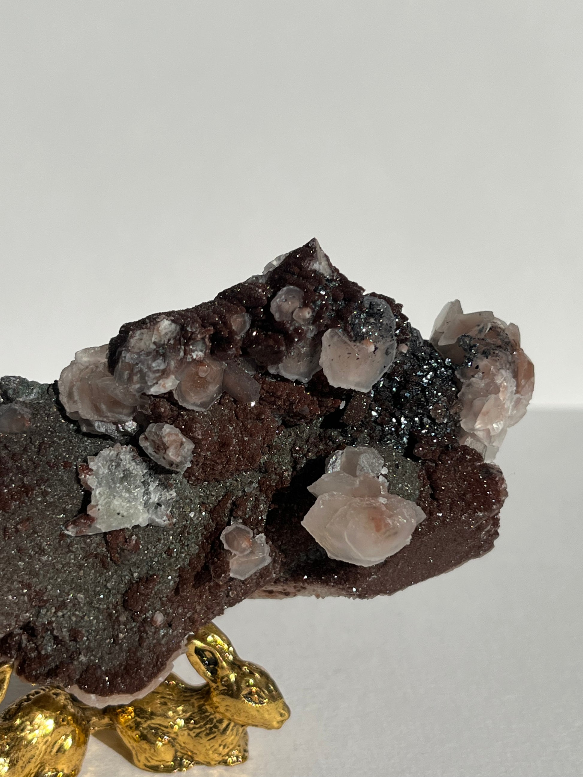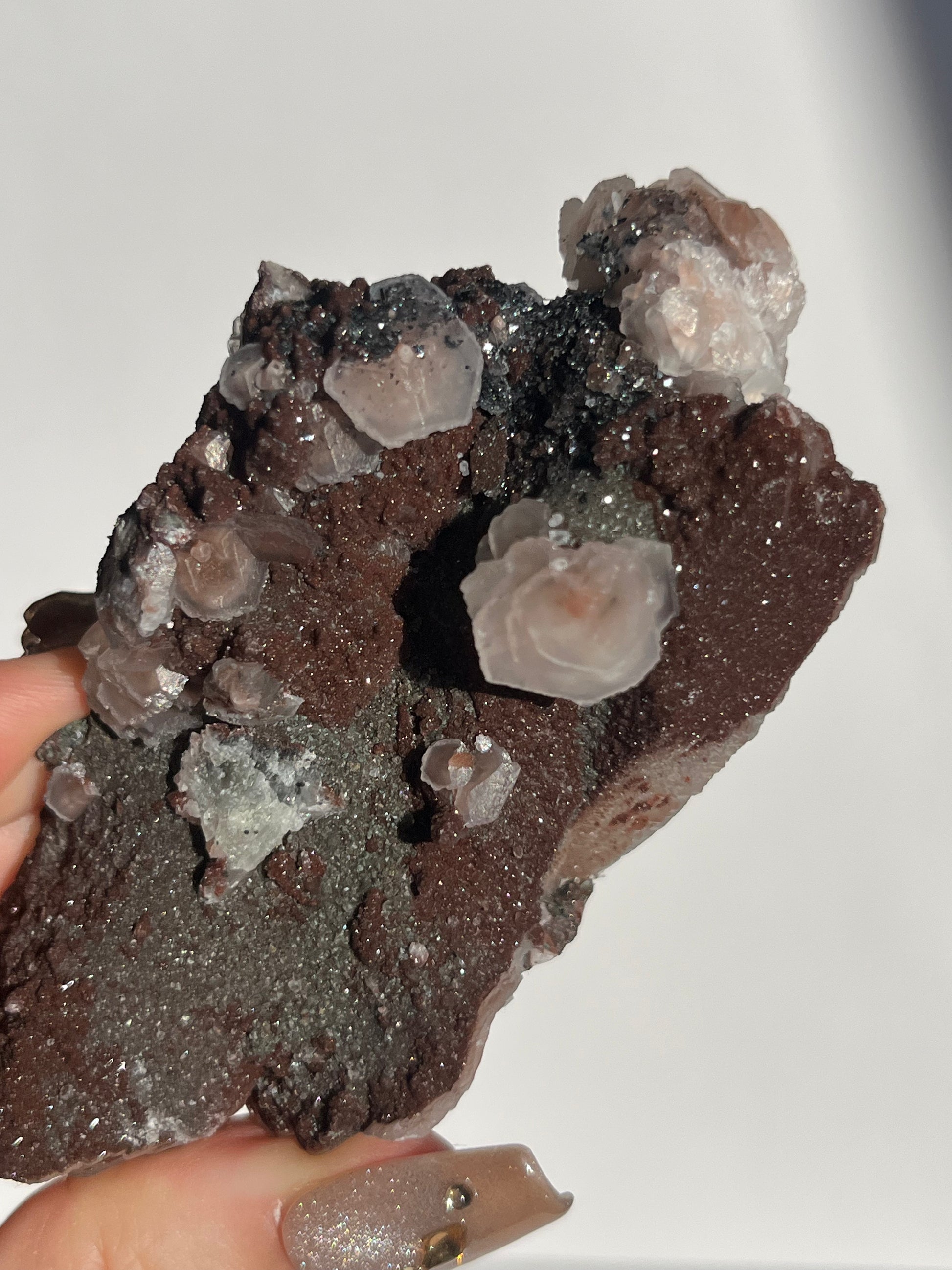 Twilight Plum Sakura Blossom Calcite on Druzy Coated Quartz Specimen C
