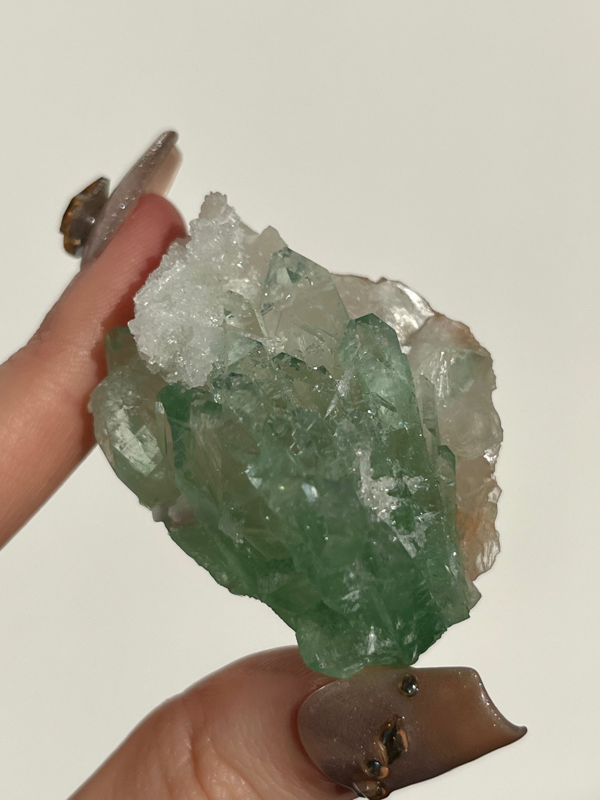 Apophyllite from Jalgaon is world-renowned, and prized for its rare green variation with sharp, natural points. These specimens combine aesthetic beauty with powerful energetic resonance, making them highly sought after among discerning collectors.