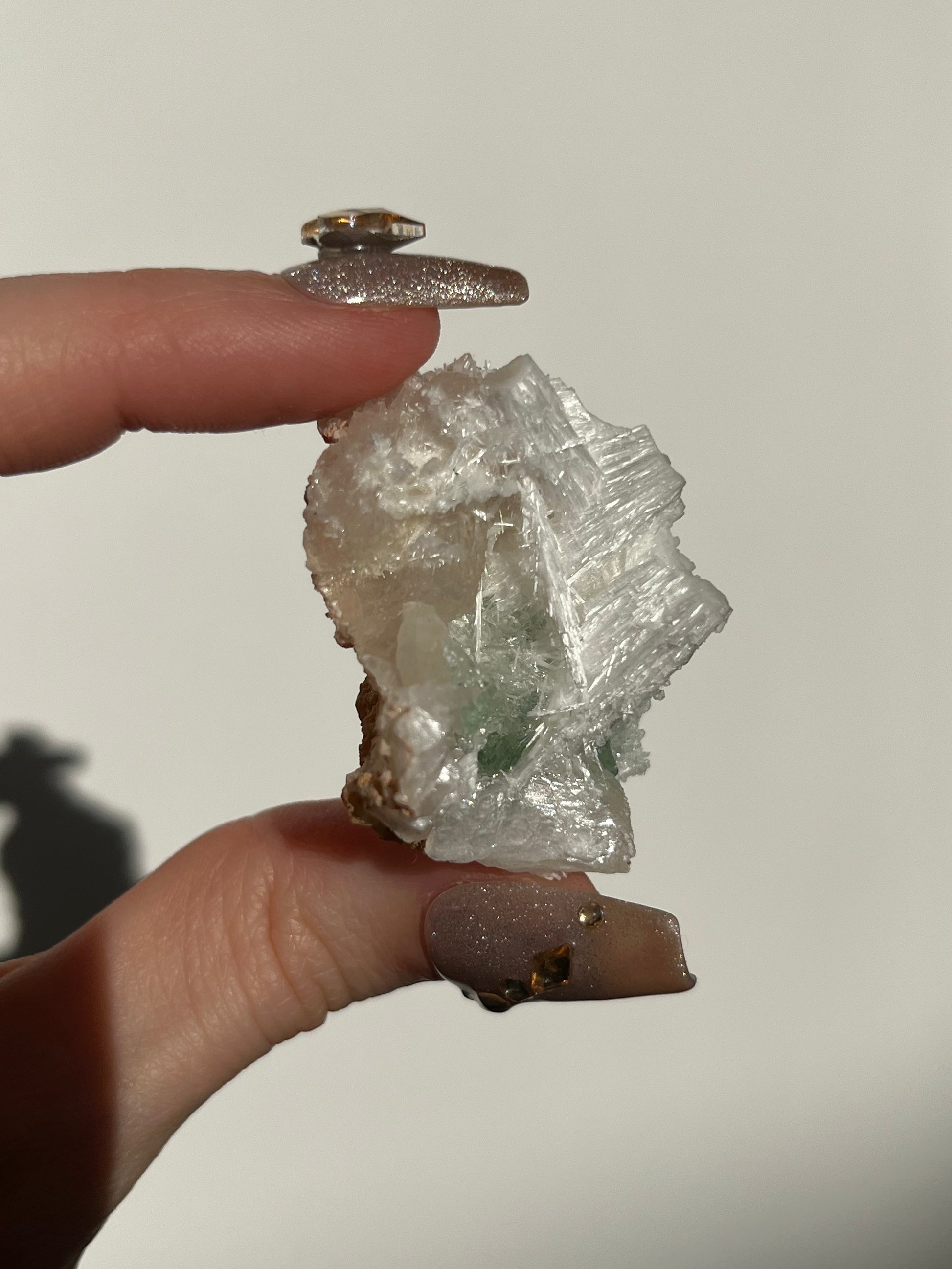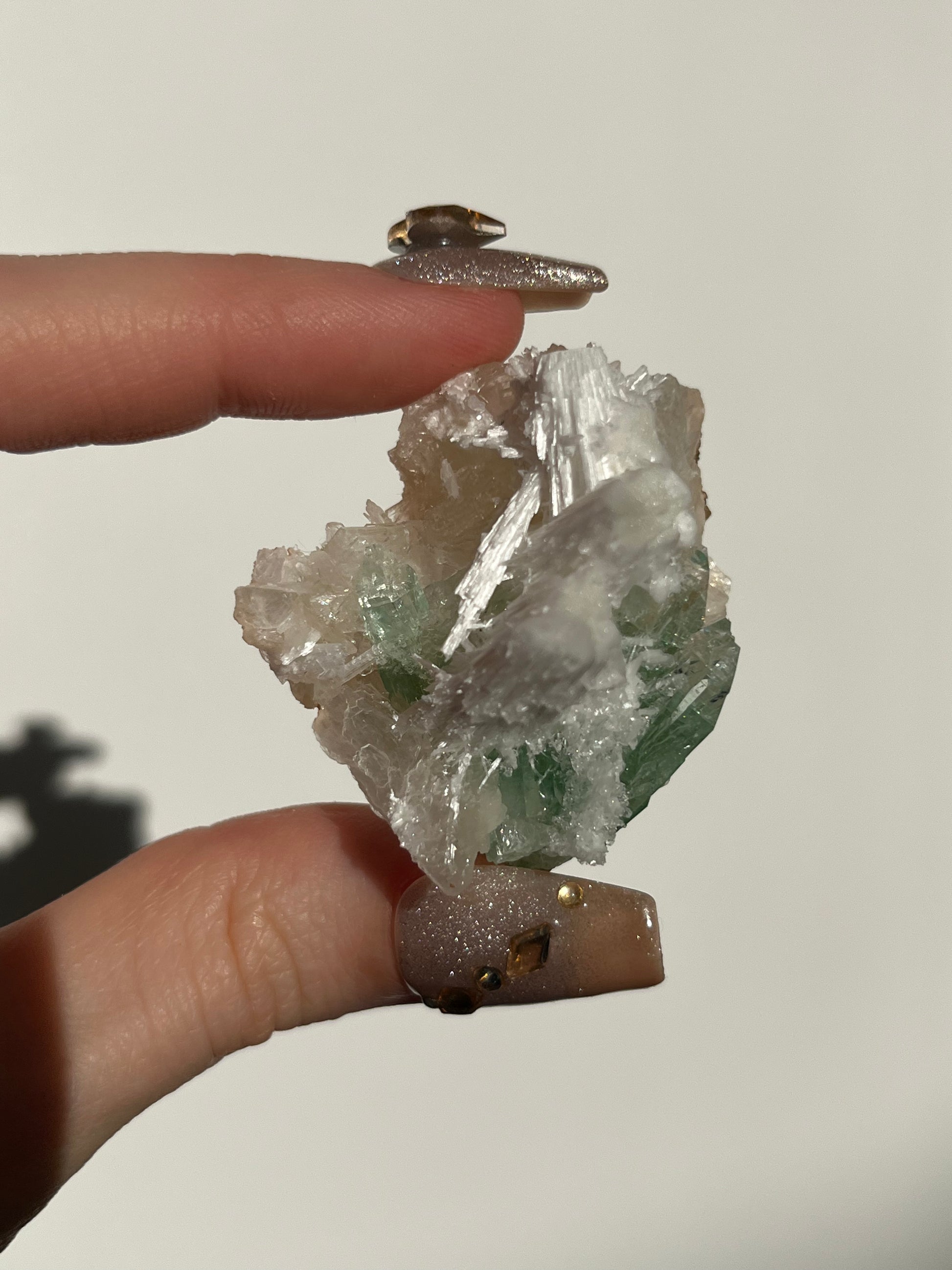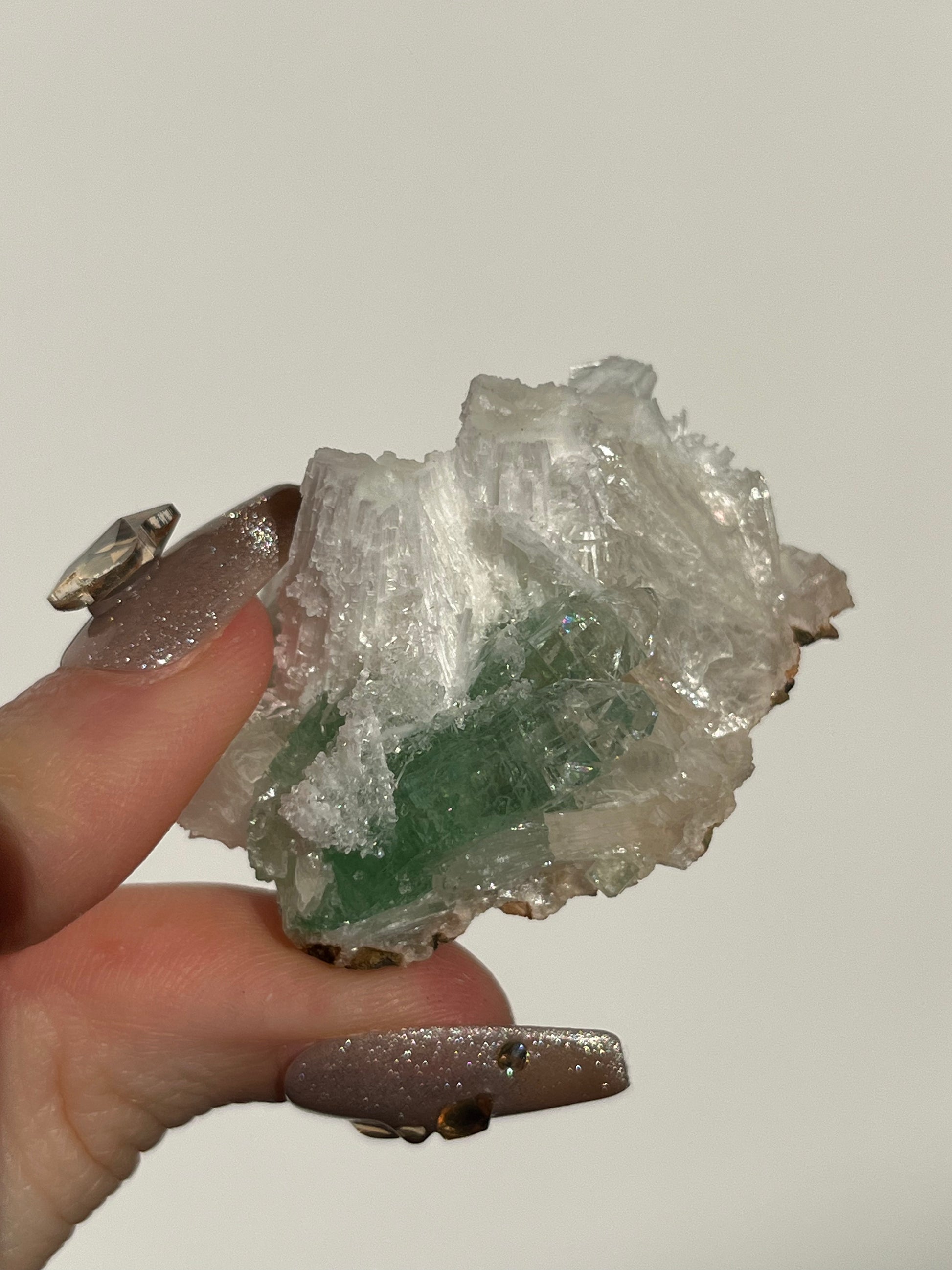 Green Apophyllite awakens the heart and clears energy with vibrant, high-frequency light, while Stilbite adds softness, comfort, and gentle guidance. Together, they balance clarity with compassion, grounding spiritual insight into everyday life.