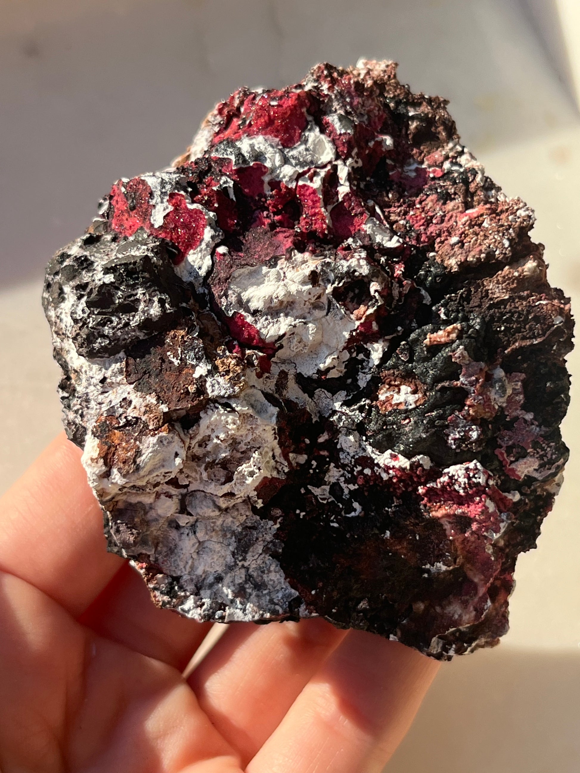 This Red Variscite is a recent find from Kedah, Malaysia. It is a rare form of Variscite due to its colour from iron rich- Ferroan (variscite is typically green), and the fact that it is crystallised (Variscite rarely crystallised).