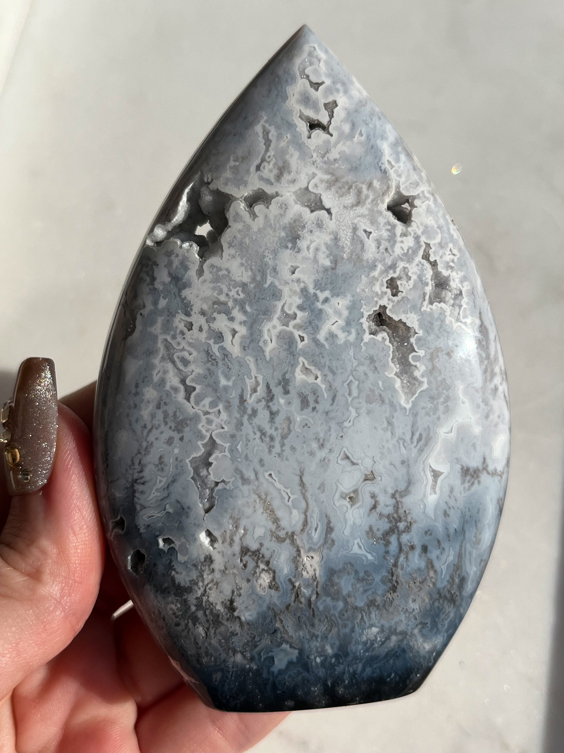 Also known as Blue Plume Agate or Pacific Blue Agate, this stone is actually a variety of chalcedony from Indonesia.